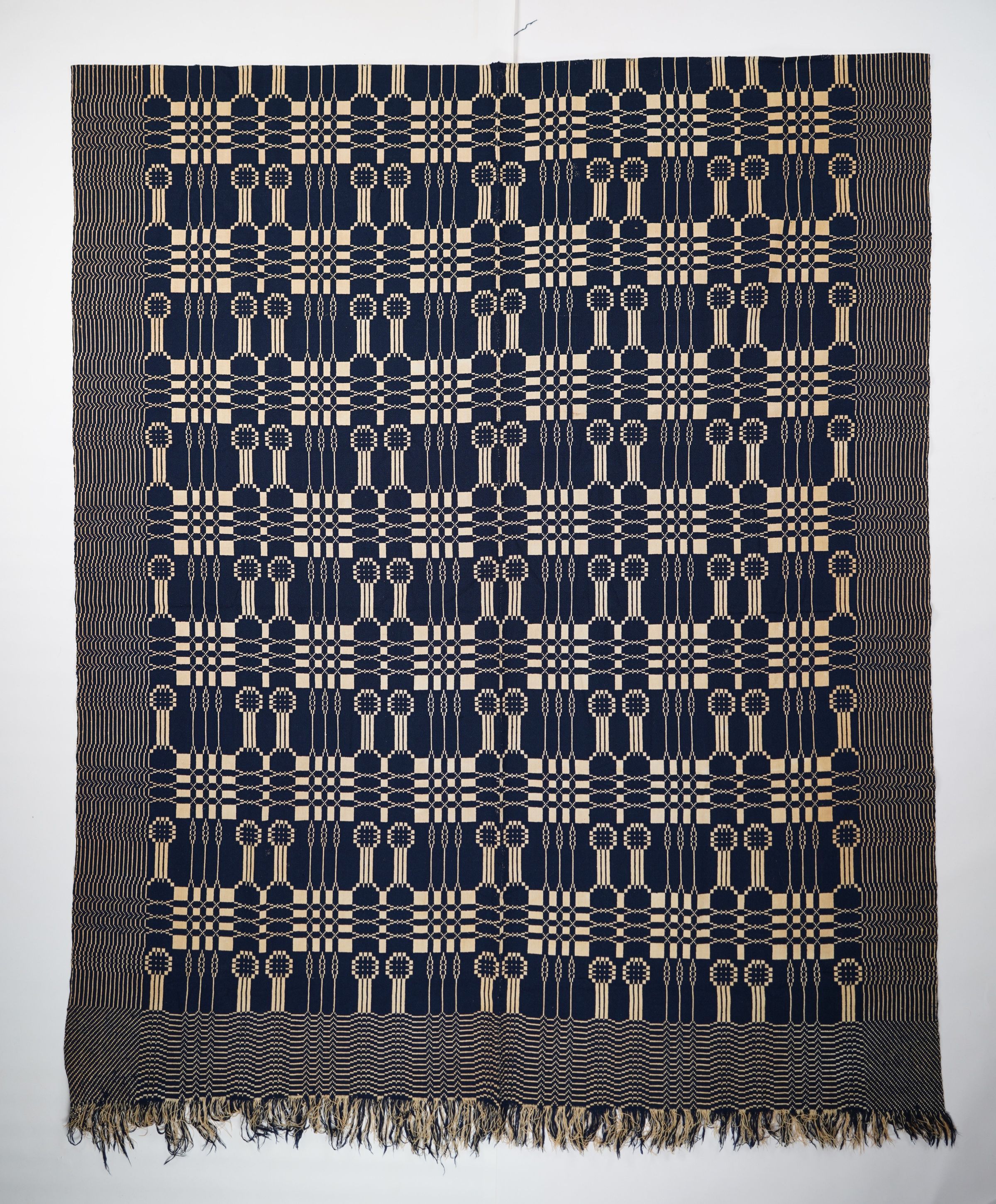 Navy and natural geometric double weave coverlet with border on three sides and self-fringe along bottom. Two joined panels.Collection