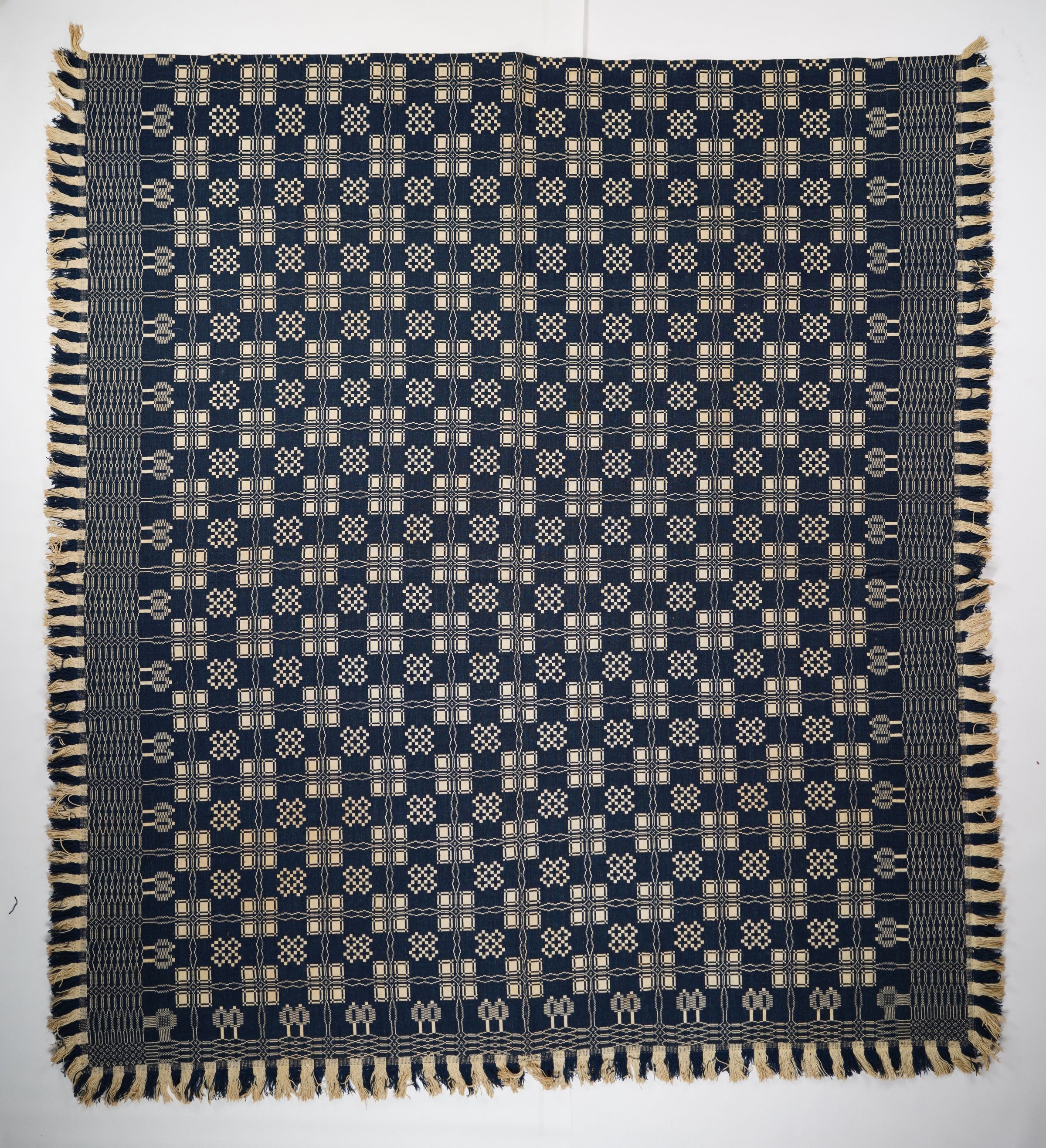 Navy and natural geometric double weave coverlet with border and applied fringe on three sides. Two joined panels.