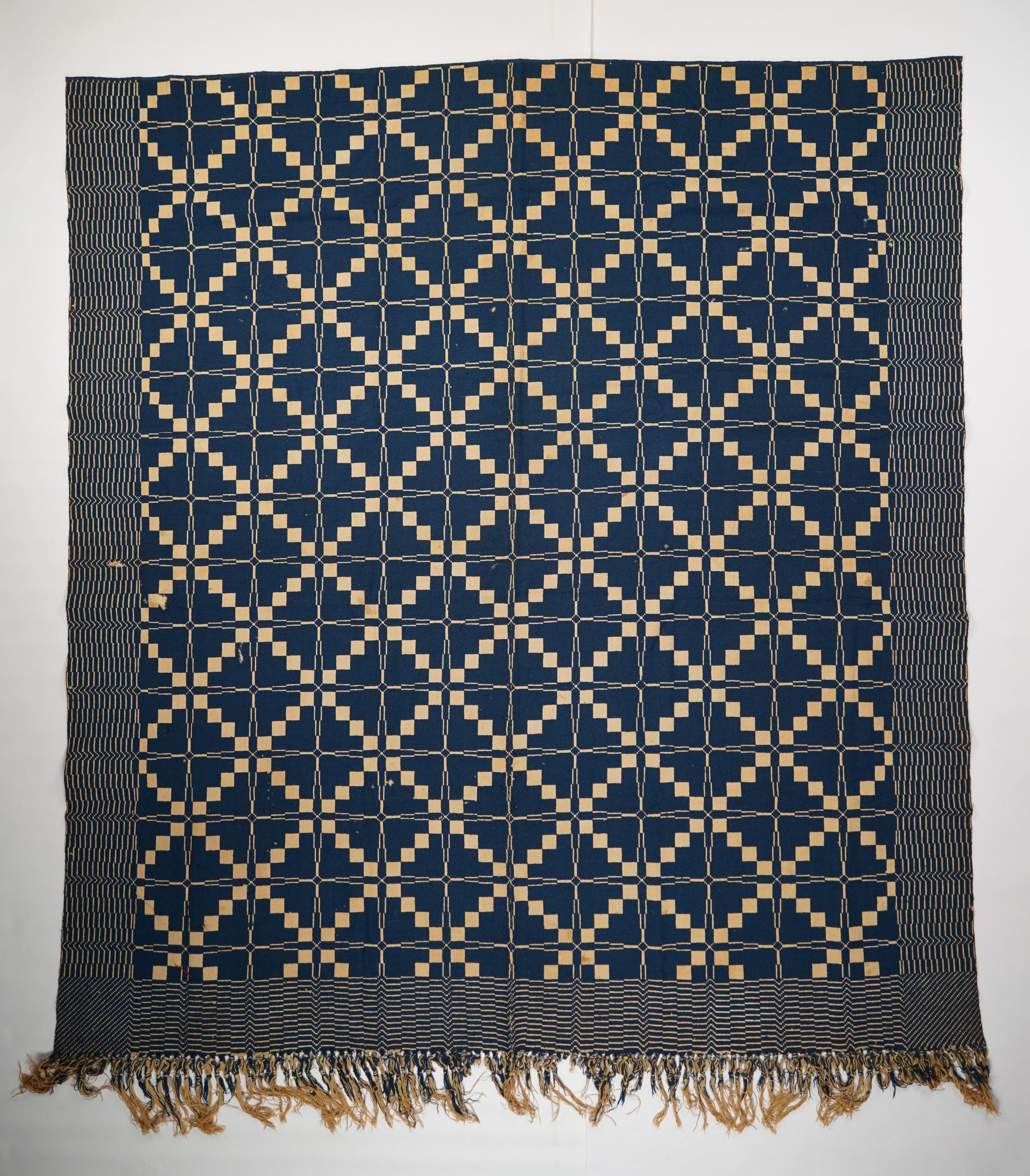 Navy and natural geometric double weave coverlet with border on three sides and knotted self-fringe along bottom. Two joined panels.Collection