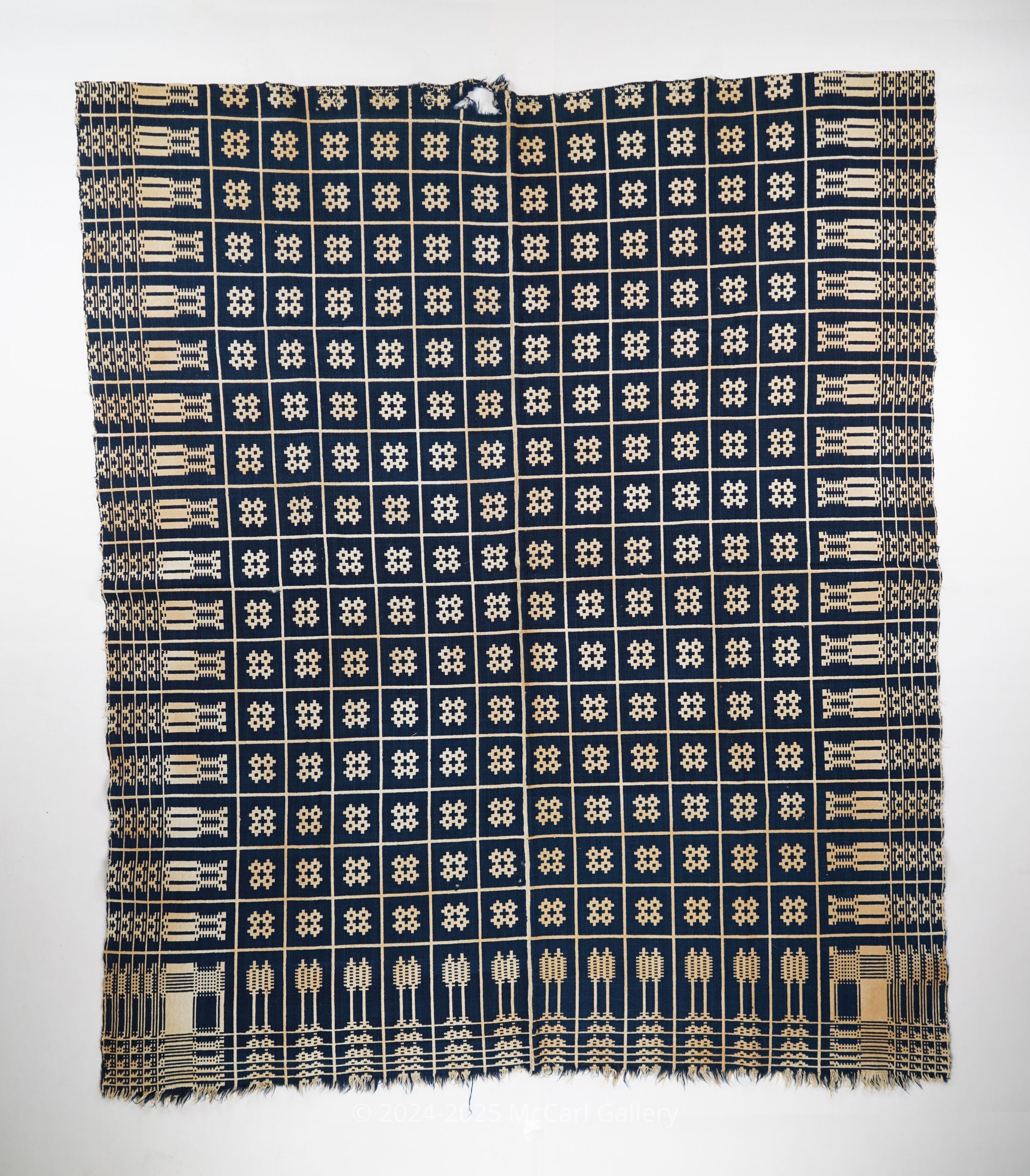 Geometric doubleweave coverlet with borders on 3 sides and self-fringe on bottom. Woven full-width; seamless. Navy wool with undyed cotton. Abstract centerfield pattern; abstract border on sides and bottom. Unknown weaver.Collection