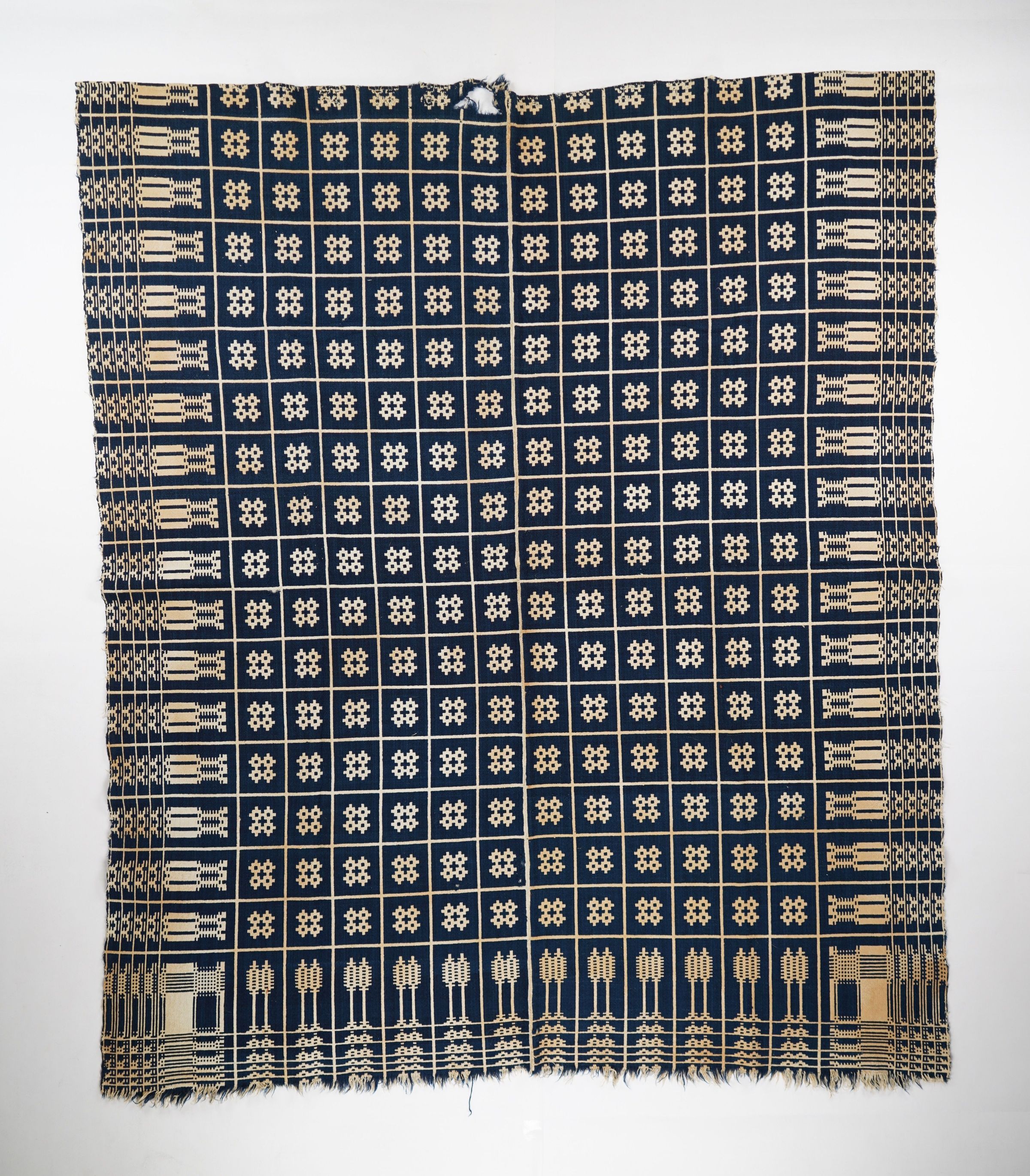 Geometric doubleweave coverlet with borders on 3 sides and self-fringe on bottom. Woven full-width; seamless. Navy wool with undyed cotton. Abstract centerfield pattern; abstract border on sides and bottom. Unknown weaver.Context