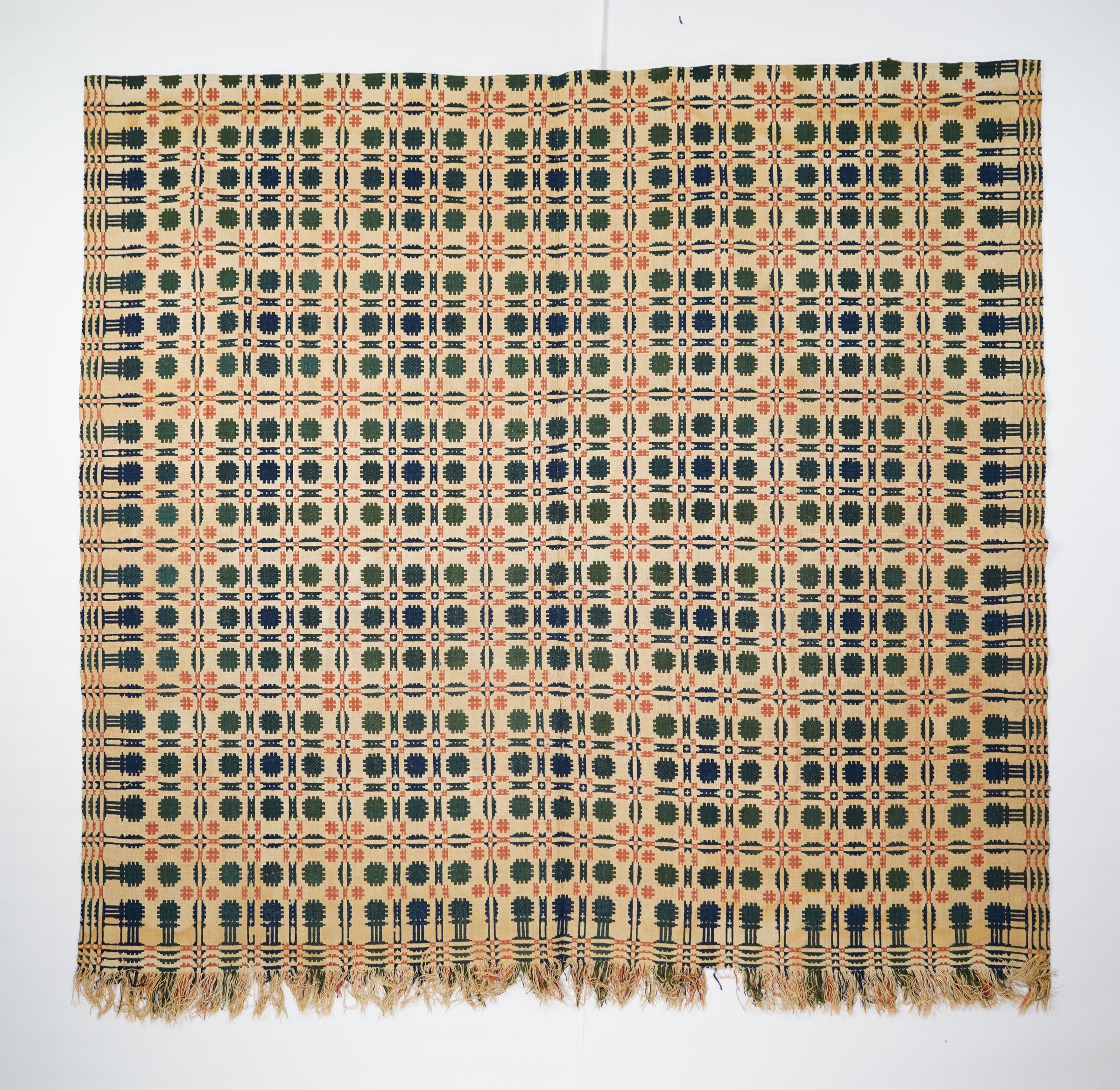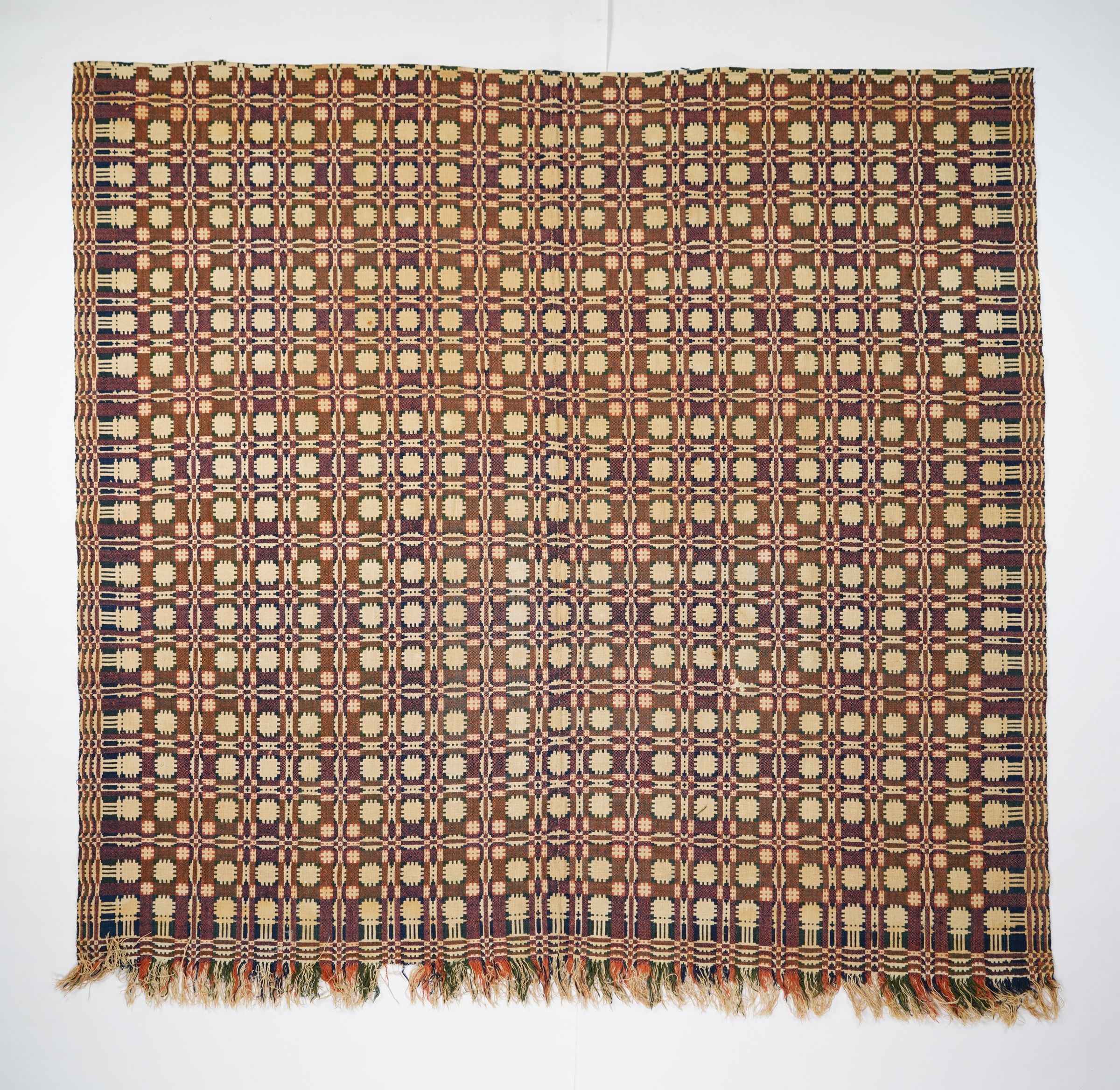 Red, green, navy, and natural geometric double weave coverlet with border on three sides and self-fringe along bottom. Two joined panels.Collection