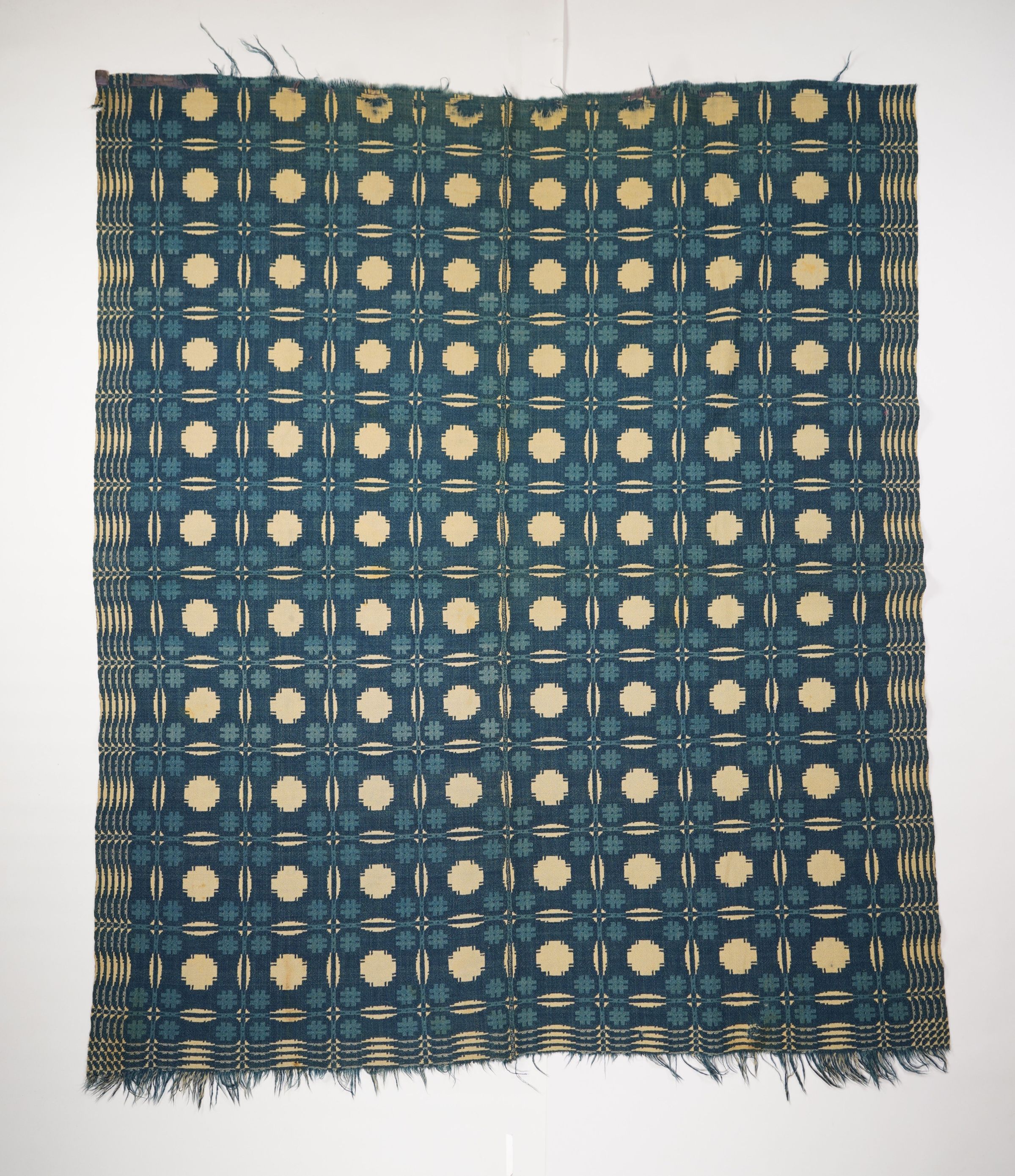 Blue, navy, and natural geometric double weave coverlet with border on three sides and self-fringe along bottom. Two joined panels.Collection