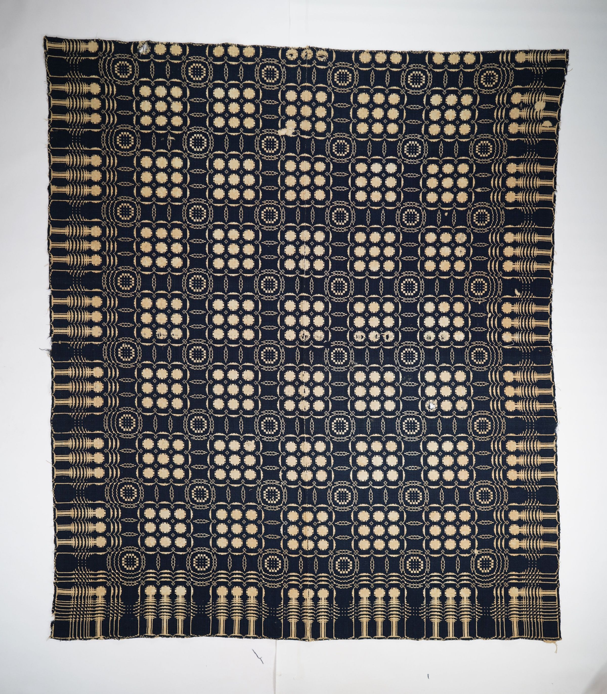 Natural and navy geometric double weave coverlet with border on three sides. Two joined panels.