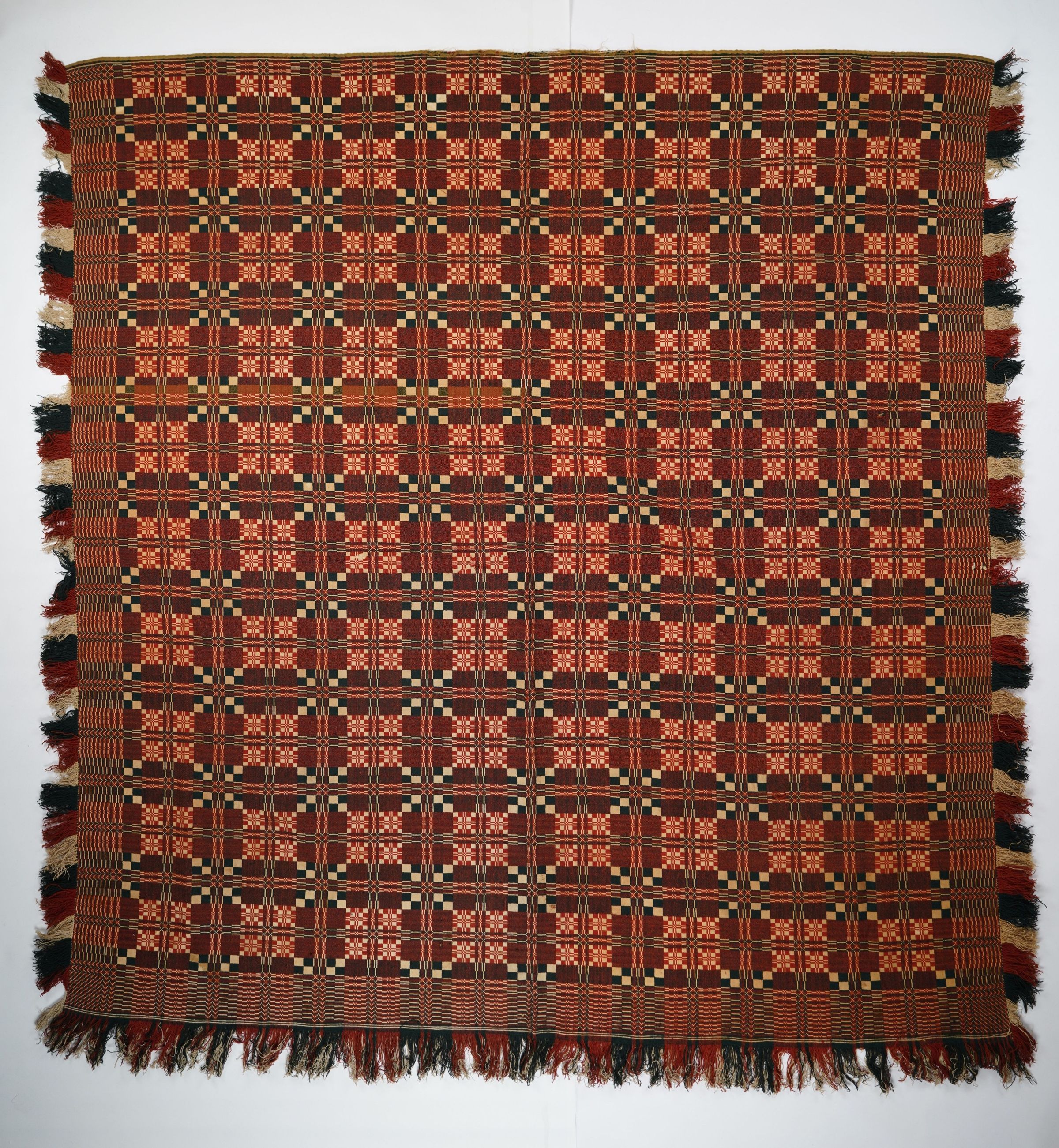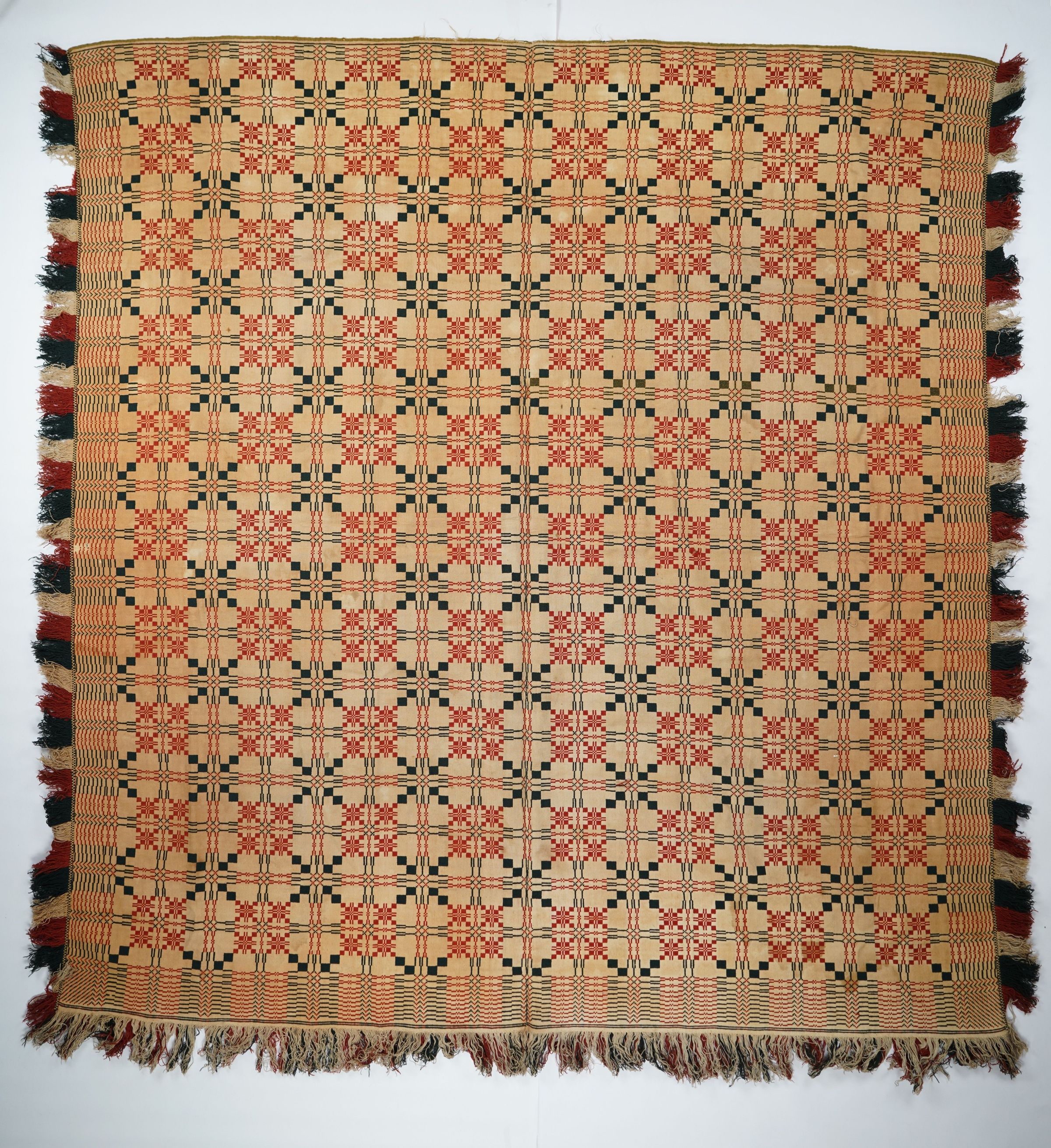 Red, navy, and natural geometric double weave coverlet with border on three sides, self-fringe along the bottom, and applied fringe along the left and right. Two joined panels.Collection