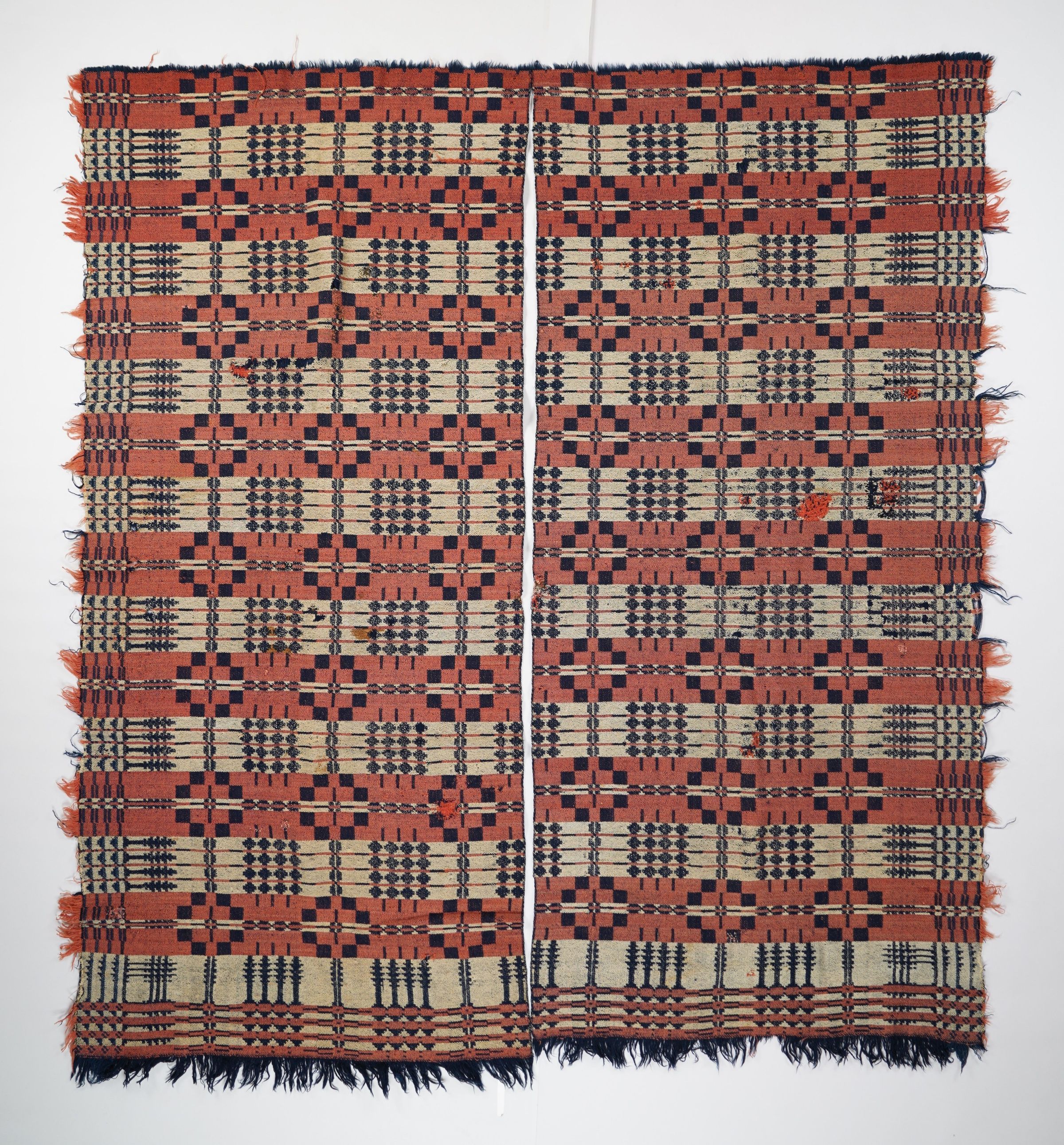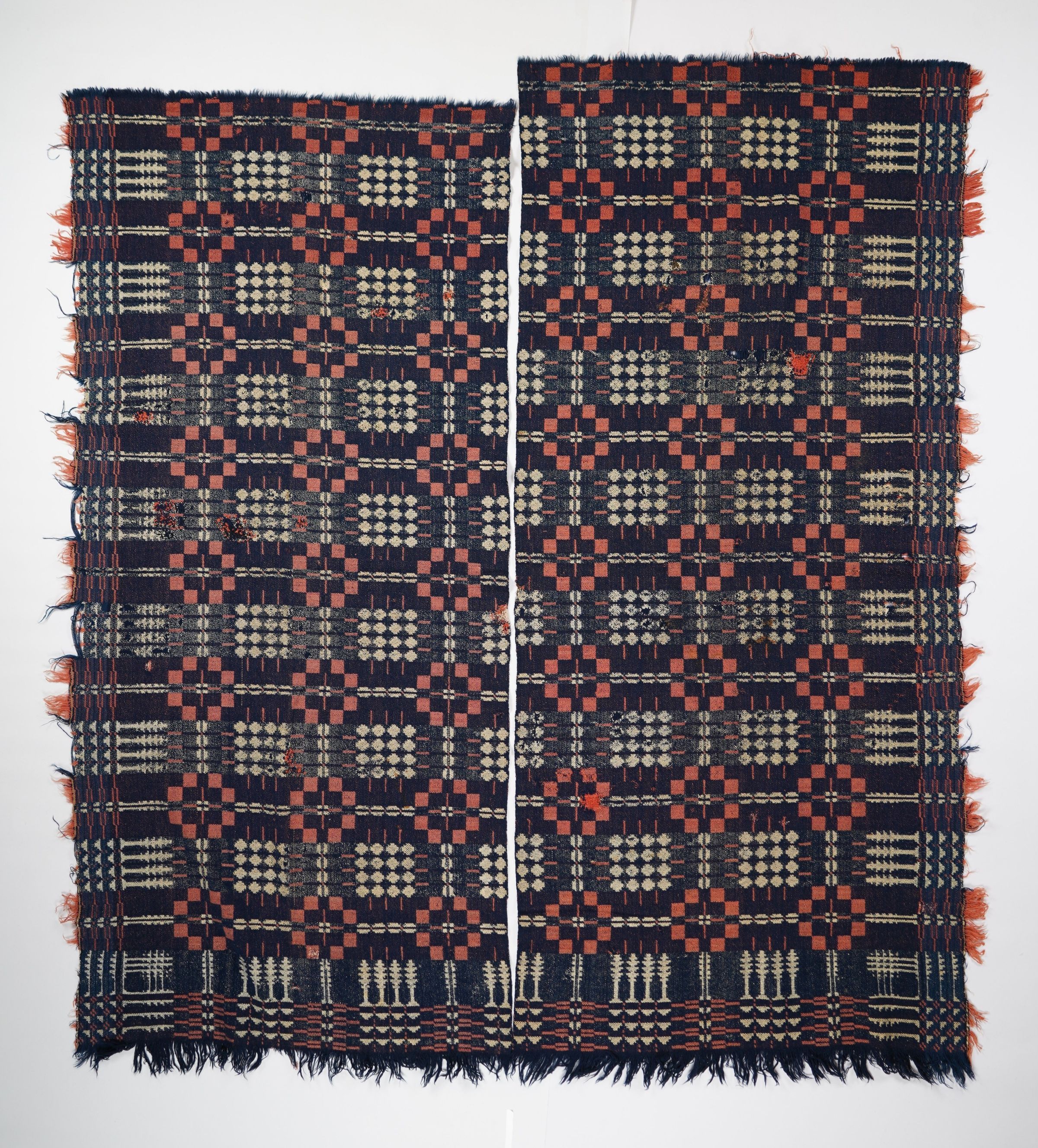 Red, navy, and natural geometric double weave coverlet with border and self-fringe on three sides. Two separated panels.Collection