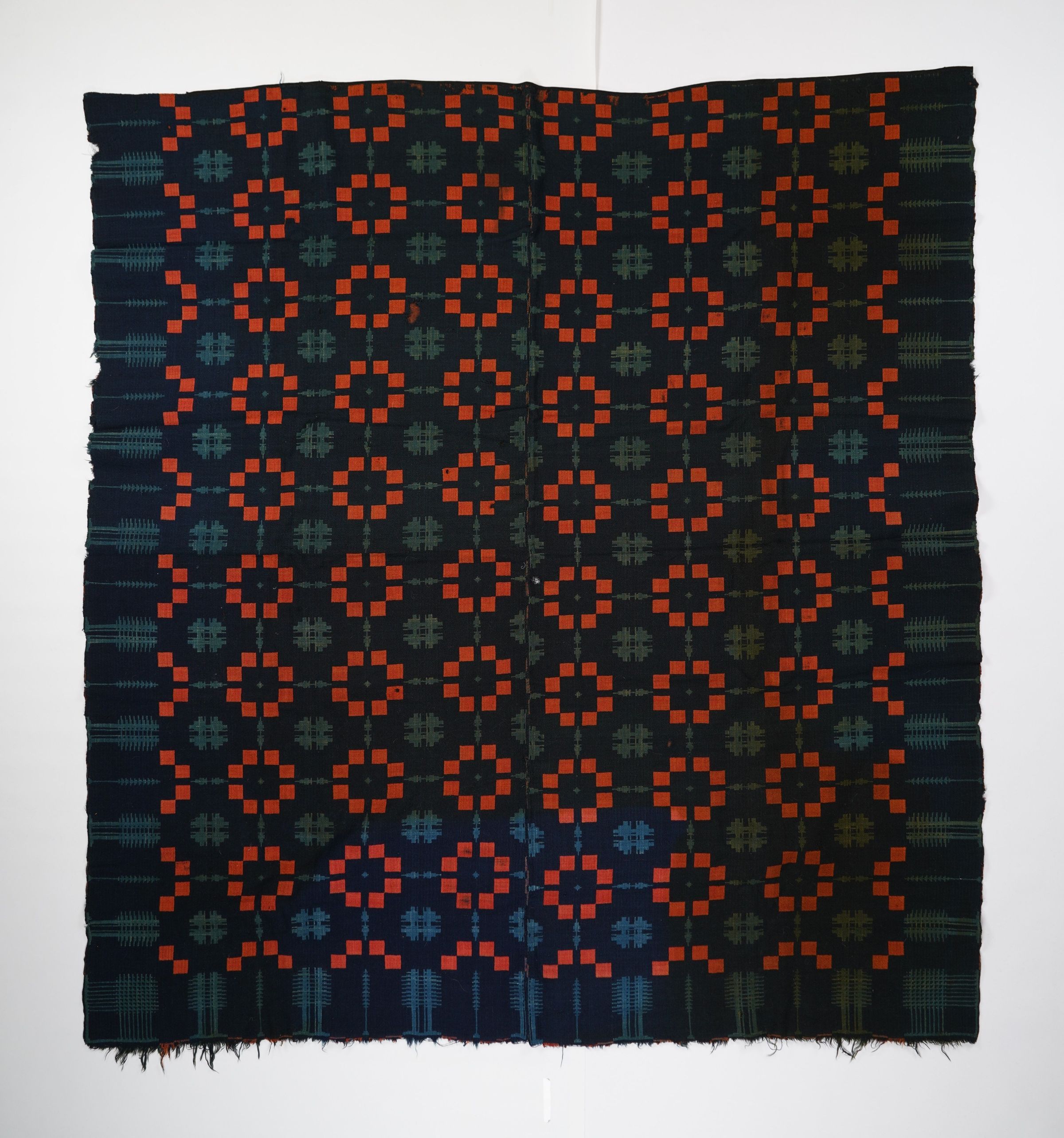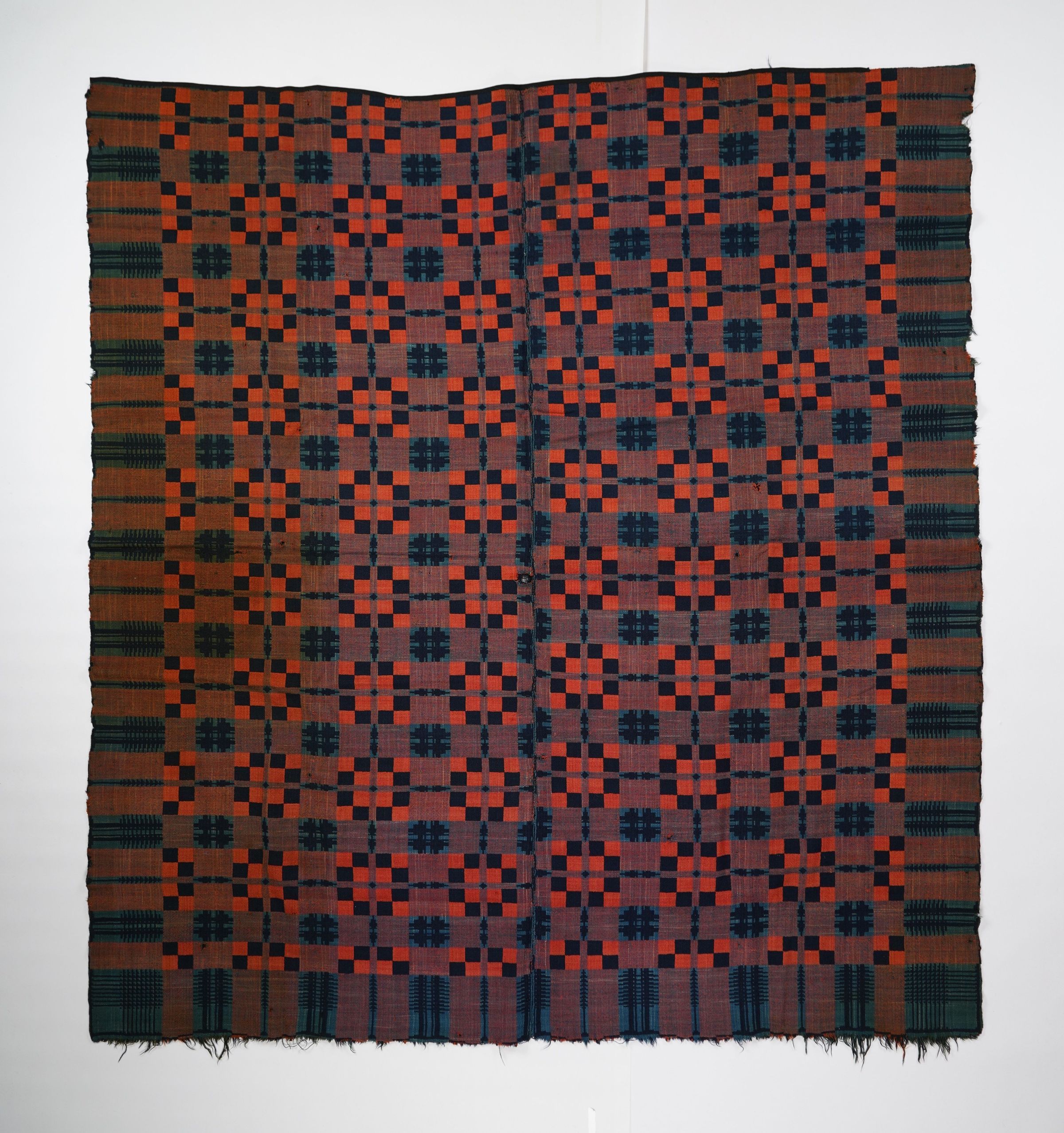 Red, blue, navy, and natural geometric double weave coverlet with border on three sides and self-fringe along bottom. Two joined panels.Collection