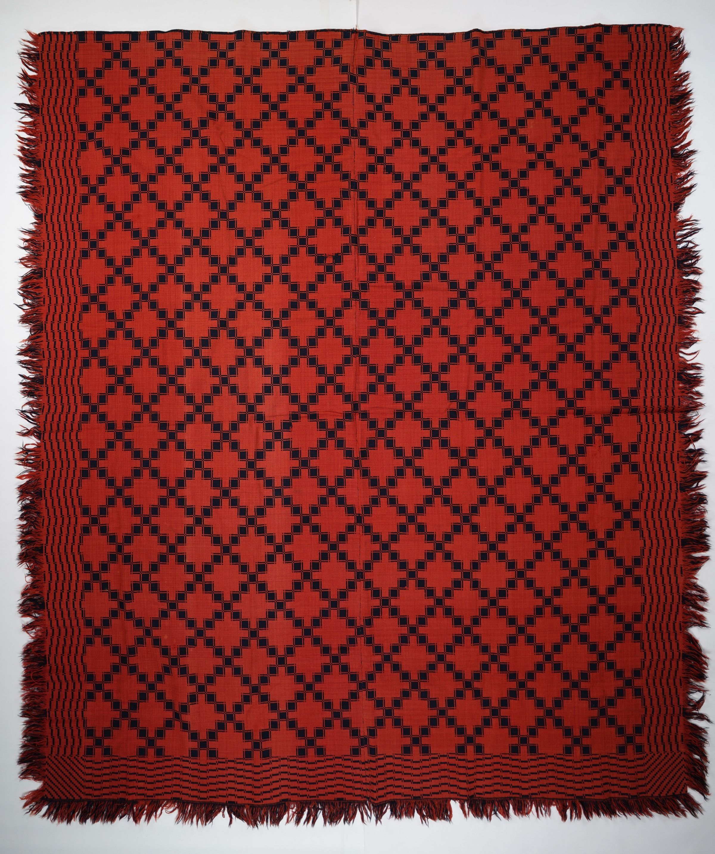 Red and navy geometric double weave coverlet with border and self-fringe on three sides. Two joined panels.