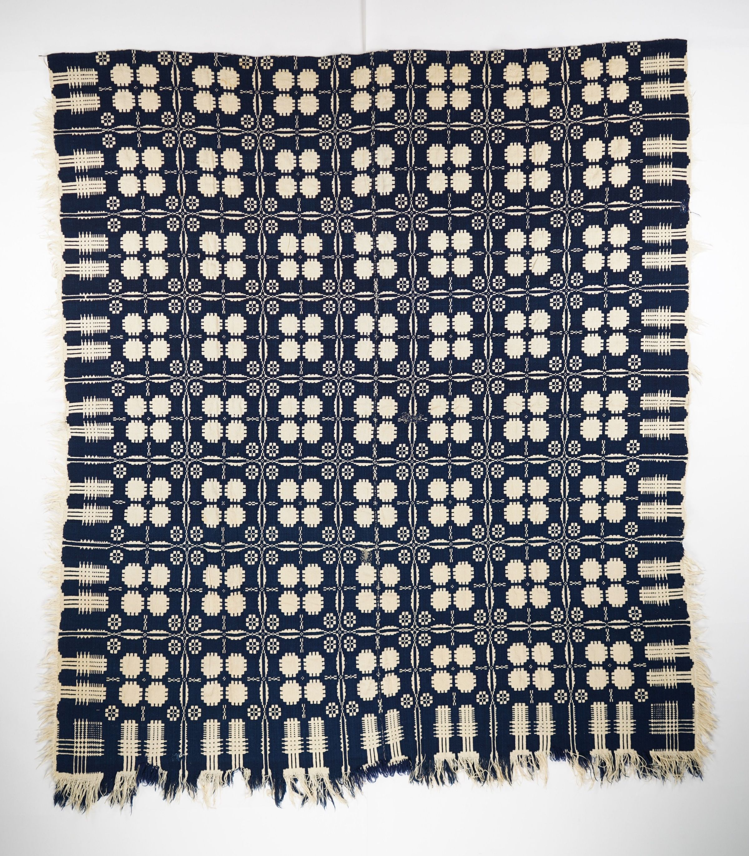 Navy and natural geometric doubleweave coverlet with fringe.