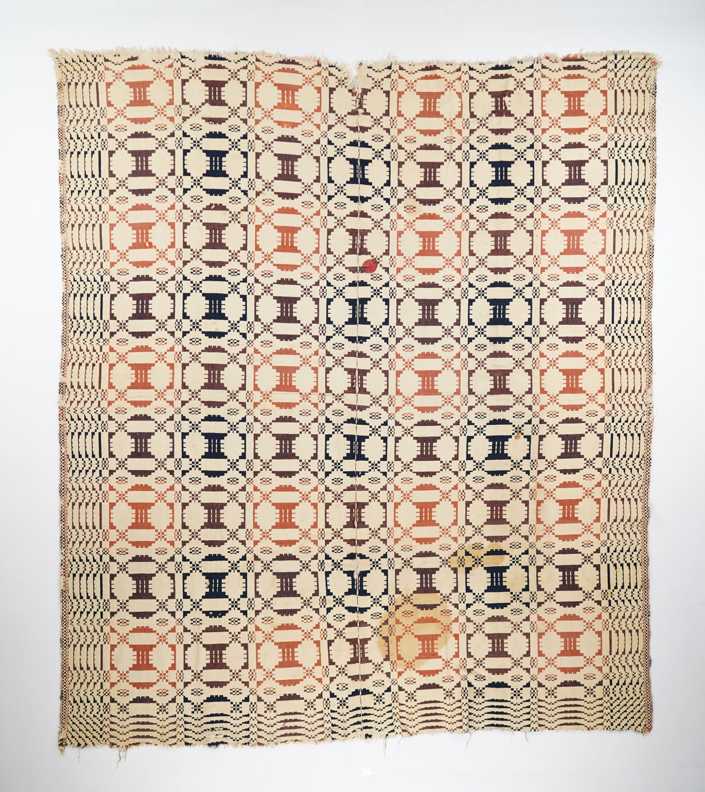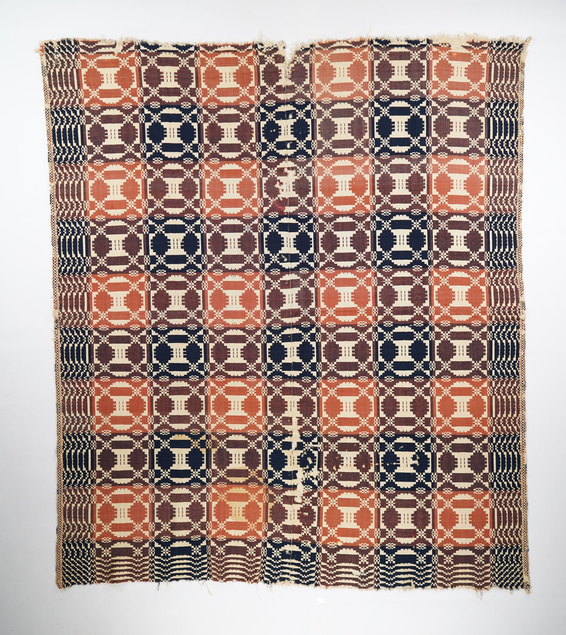 Geometric doubleweave coverlet with borders on 3 sides and no fringe. Two panels joined by a center seam. Navy and red wool with undyed cotton. Abstract centerfield pattern; geometric border on sides and bottom. Unknown weaver.Context