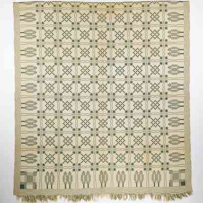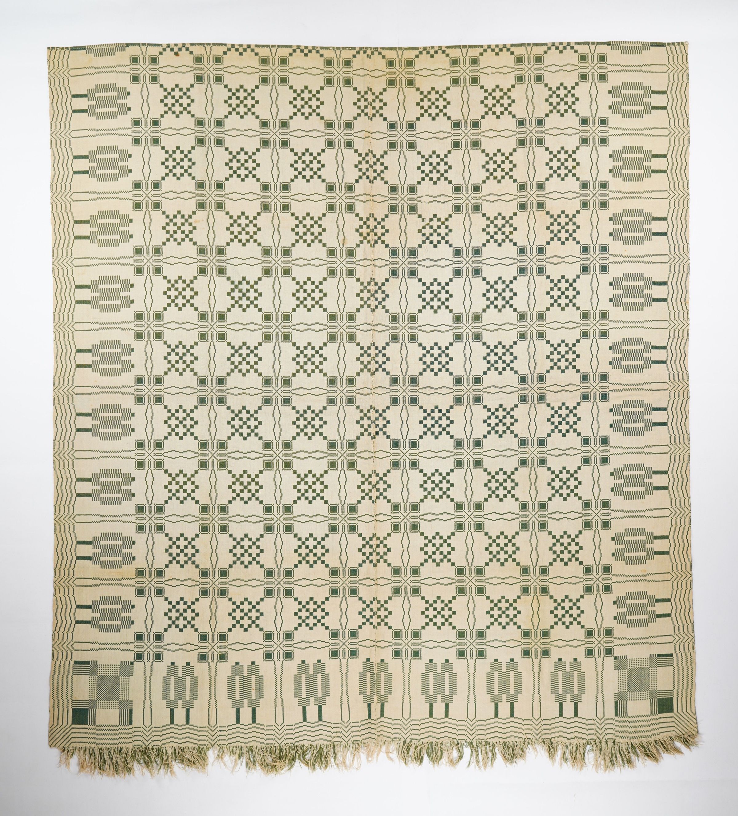Geometric doubleweave coverlet with borders on 3 sides and self-fringe on bottom. Two panels joined by a center seam. Green wool with undyed cotton. Abstract centerfield pattern; tree border on sides and bottom. Unknown weaver.Context
