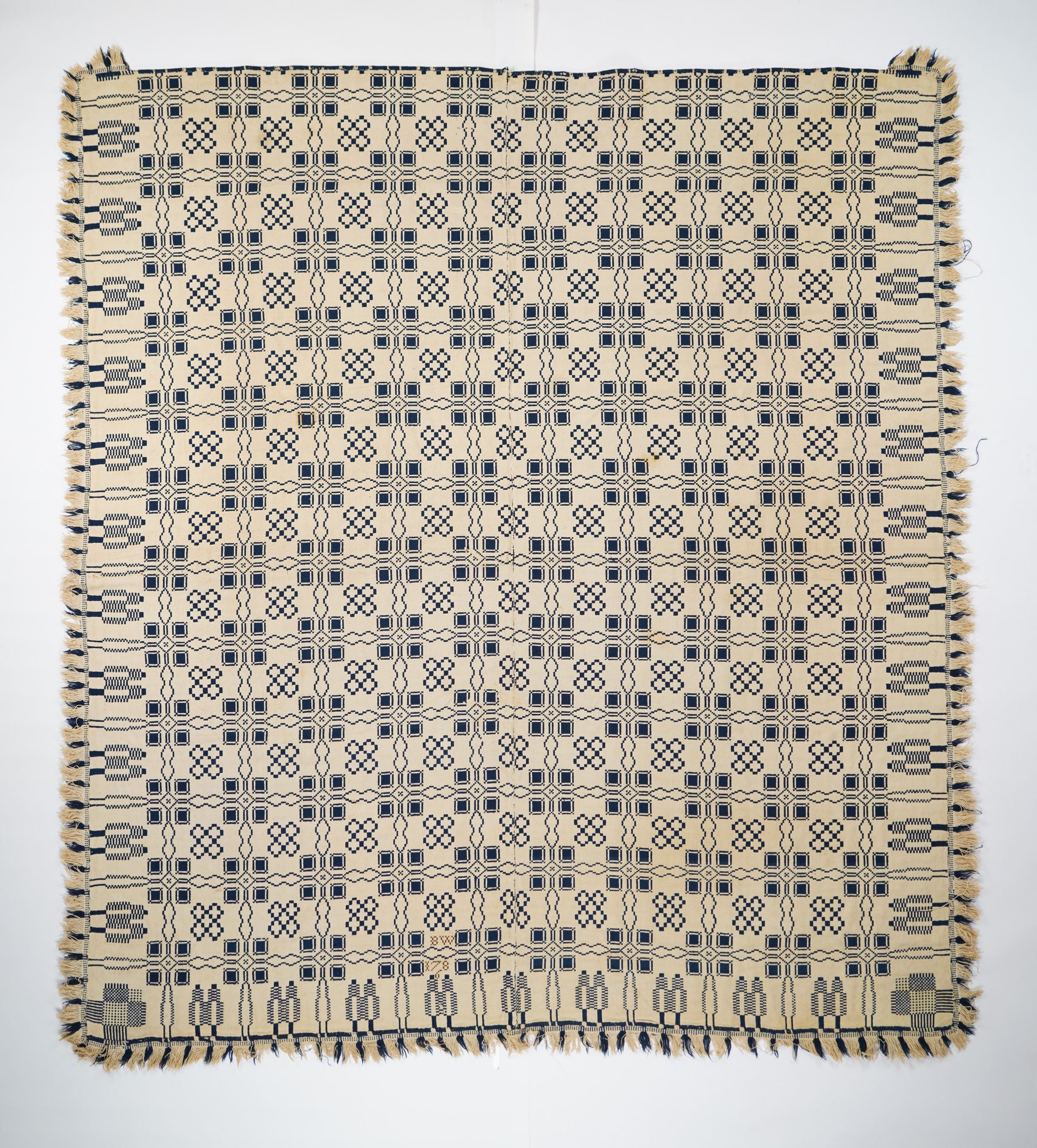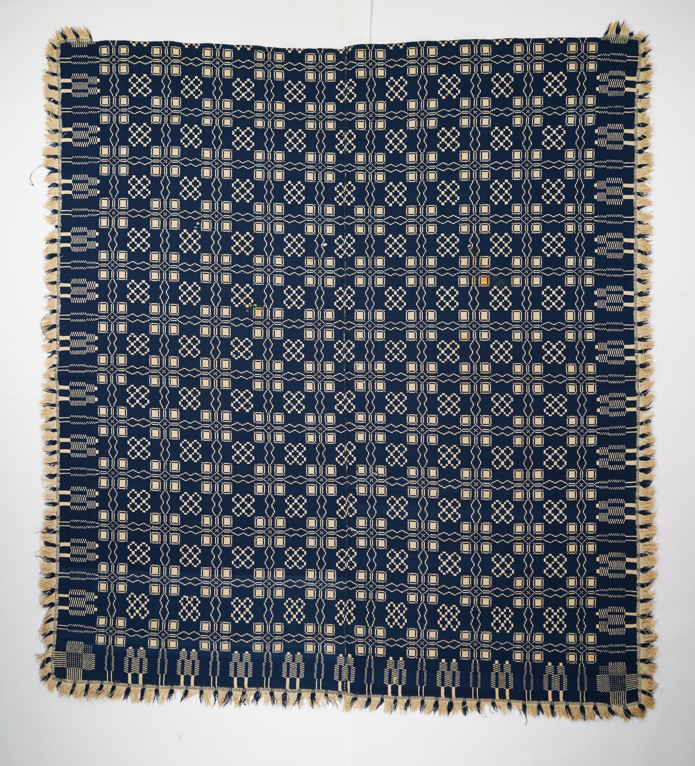 Navy and natural geometric double weave coverlet with border and applied fringe on three sides. The fringe wraps around slightly to the top side. Two joined panels. On the white side of the coverlet "BW / 178 / 6" is cross-stitched near the center seam.Collection