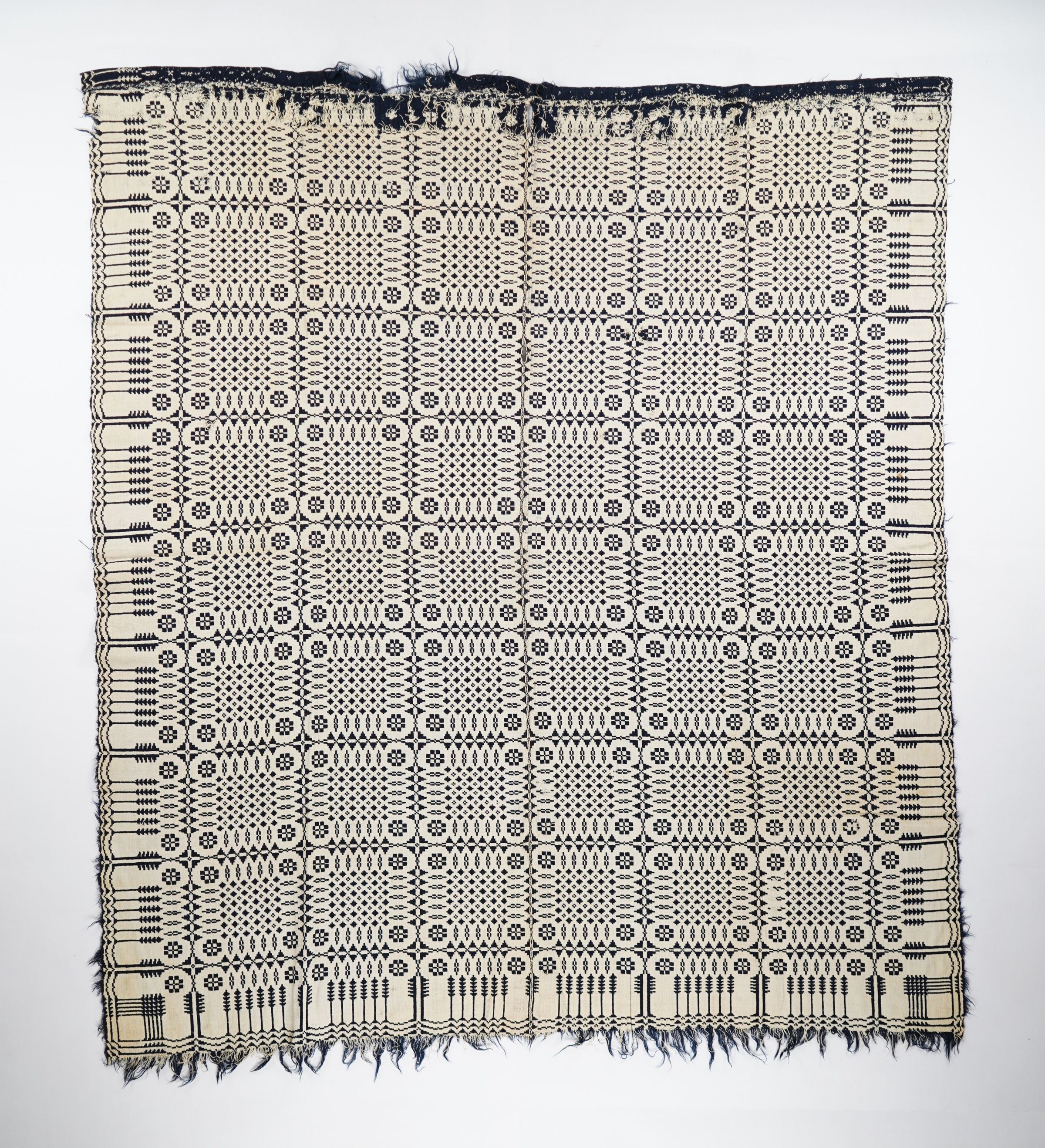 Geometric doubleweave coverlet with borders on 3 sides and self-fringe on bottom and little self-fringe on sides. Two panels joined by a center seam. Navy wool with undyed cotton. Abstract centerfield pattern; pine tree border on sides and bottom. Unknown weaver.Context
