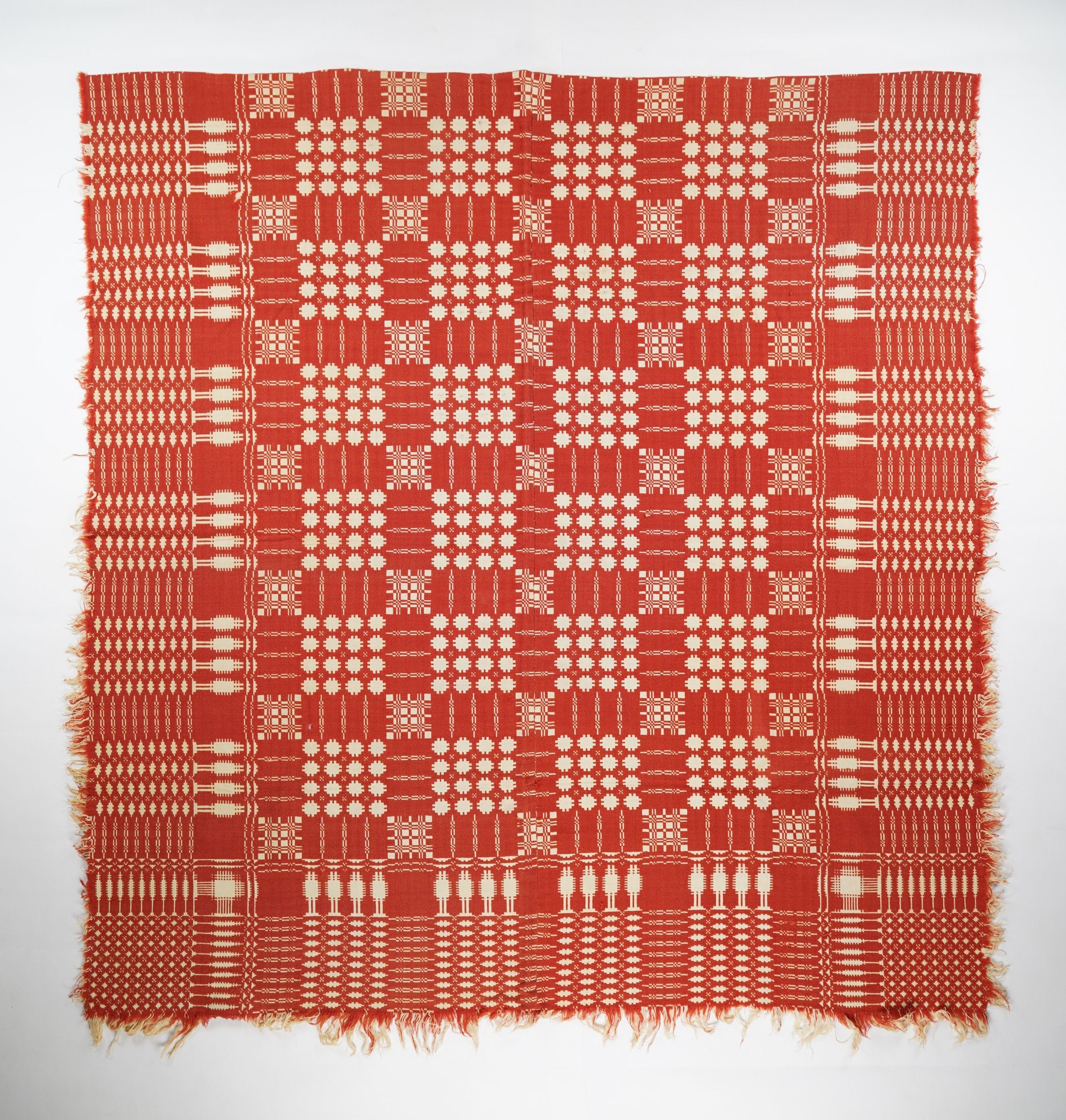 Geometric doubleweave coverlet with borders on 3 sides and self-fringe on sides and bottom. Two panels joined by a center seam. Red wool with undyed cotton. Abstract centerfield pattern; pine tree border on sides and bottom. Unknown weaver.Context