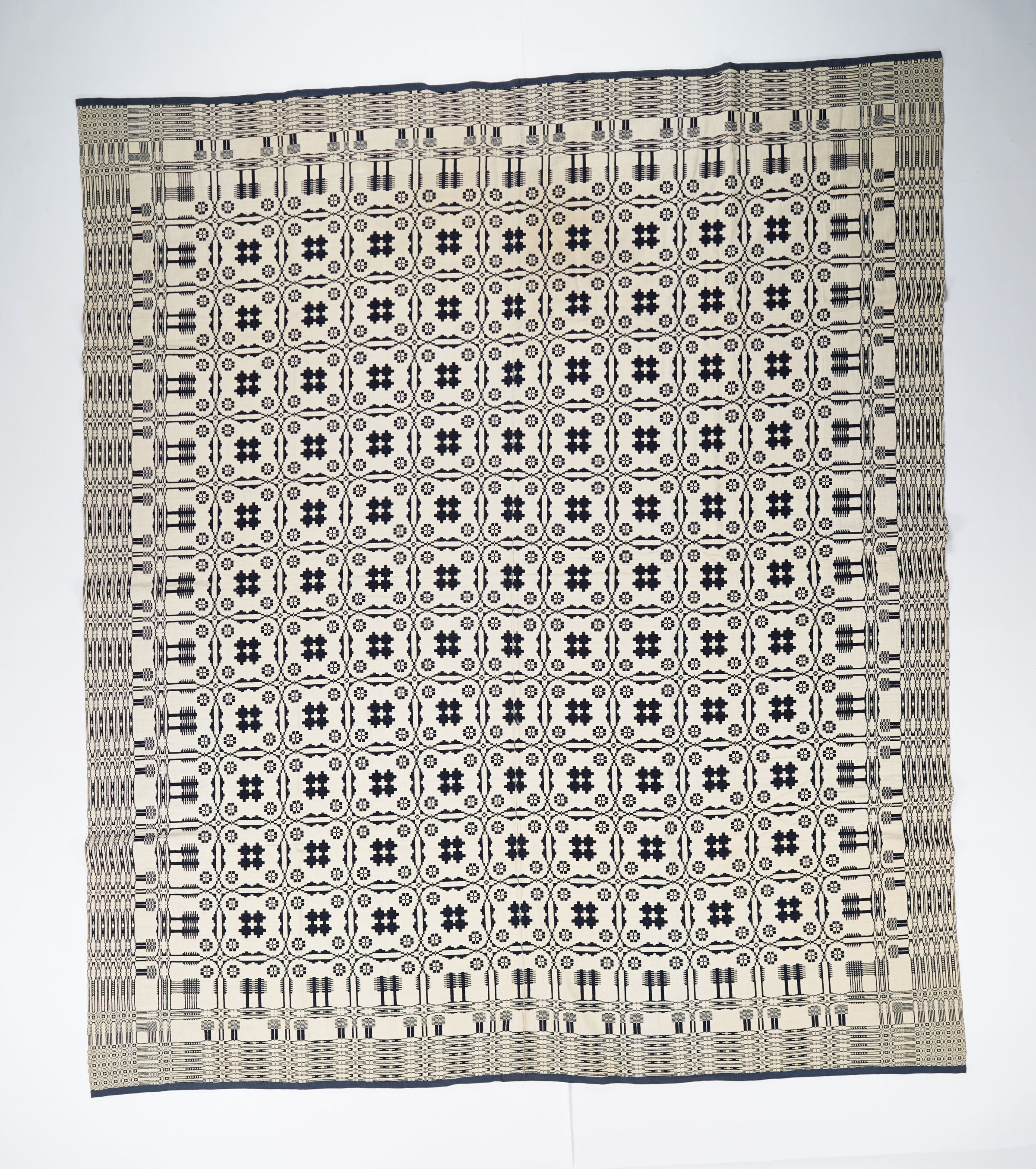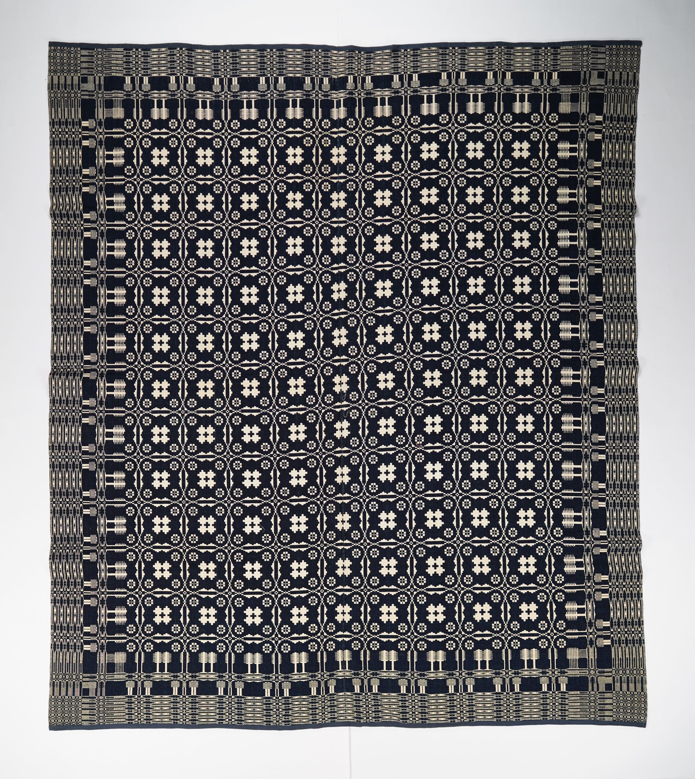 Navy and natural geometric doubleweave coverlet.Photograph Details