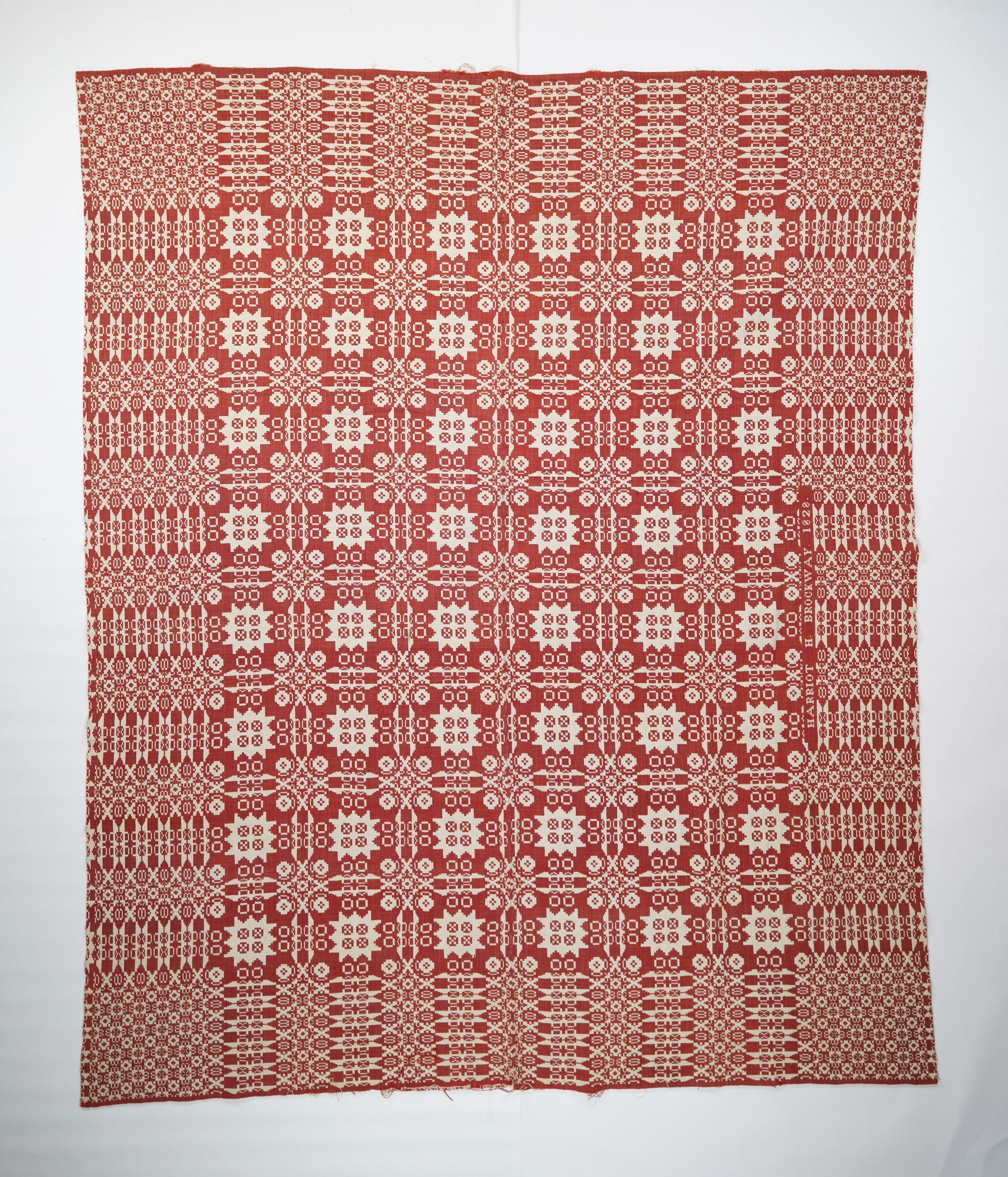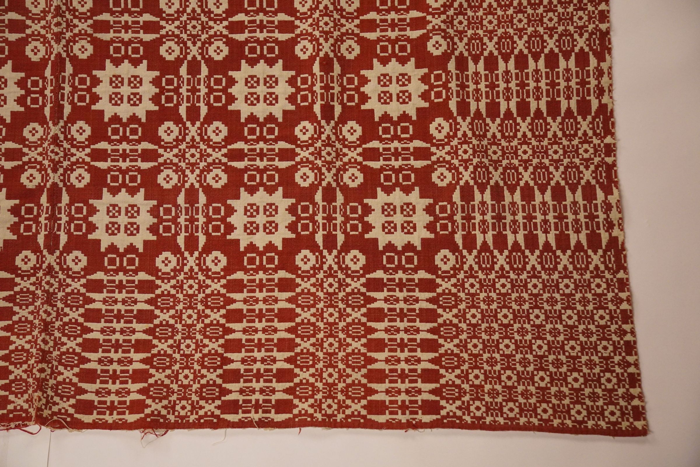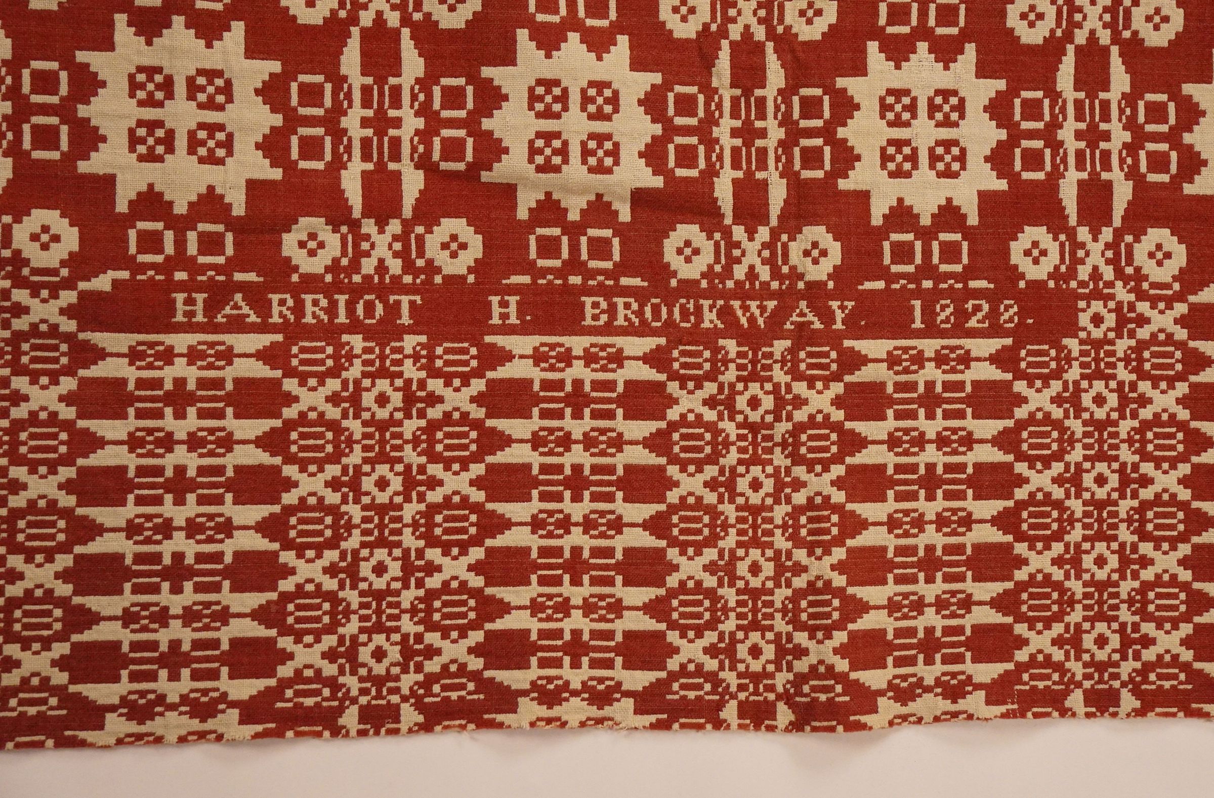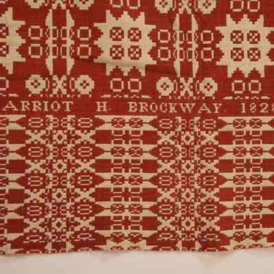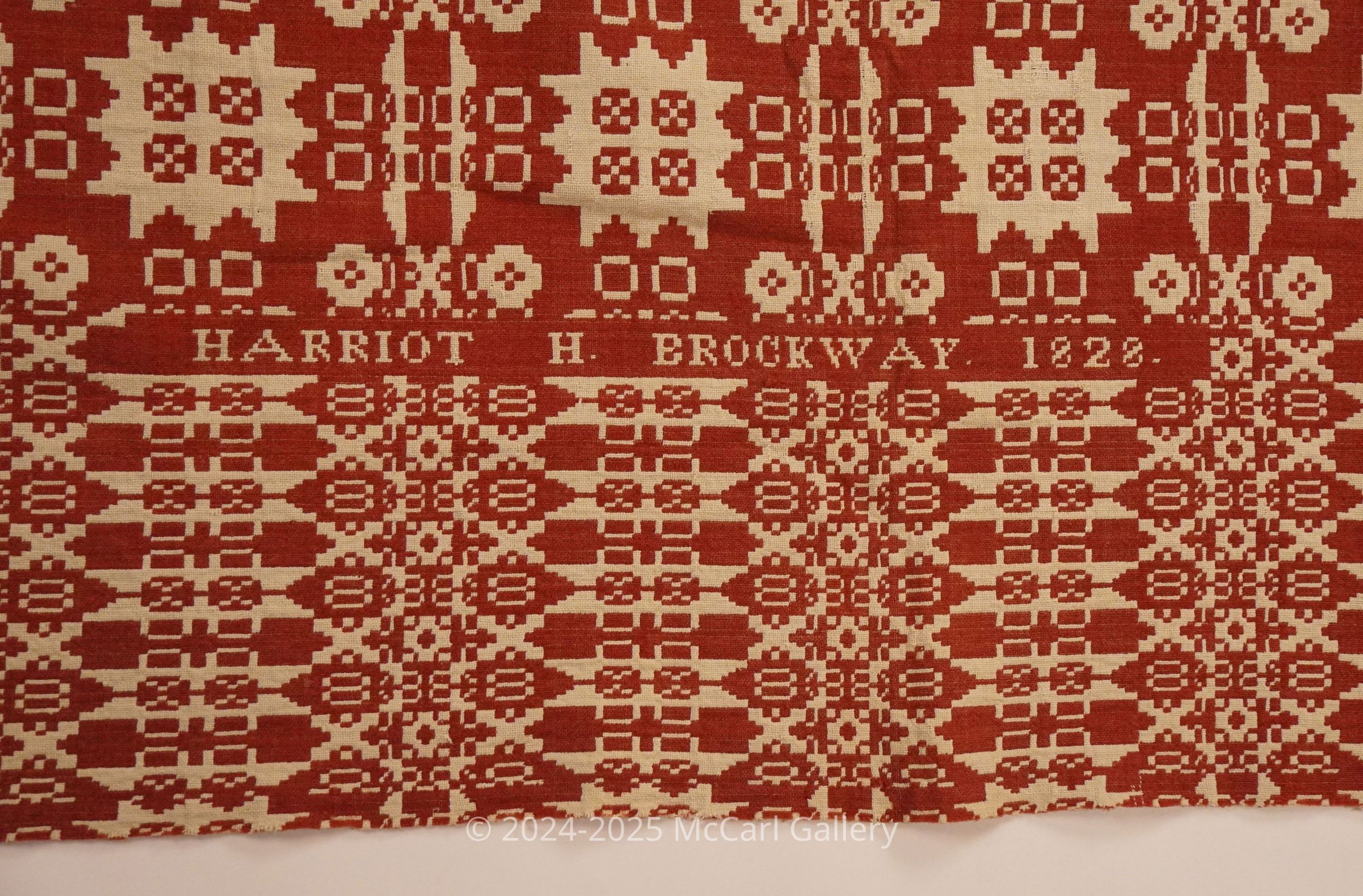 Red and natural geometric doublecloth coverlet with border on four sides. Two joined panels. Woven for Harriot H. Brockway in Palmyra, Wayne Co., New York in 1828.Collection