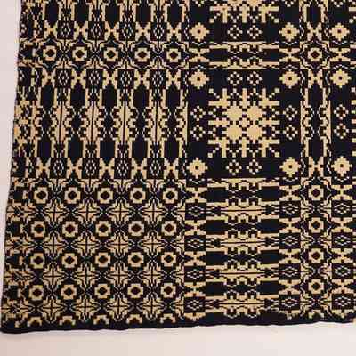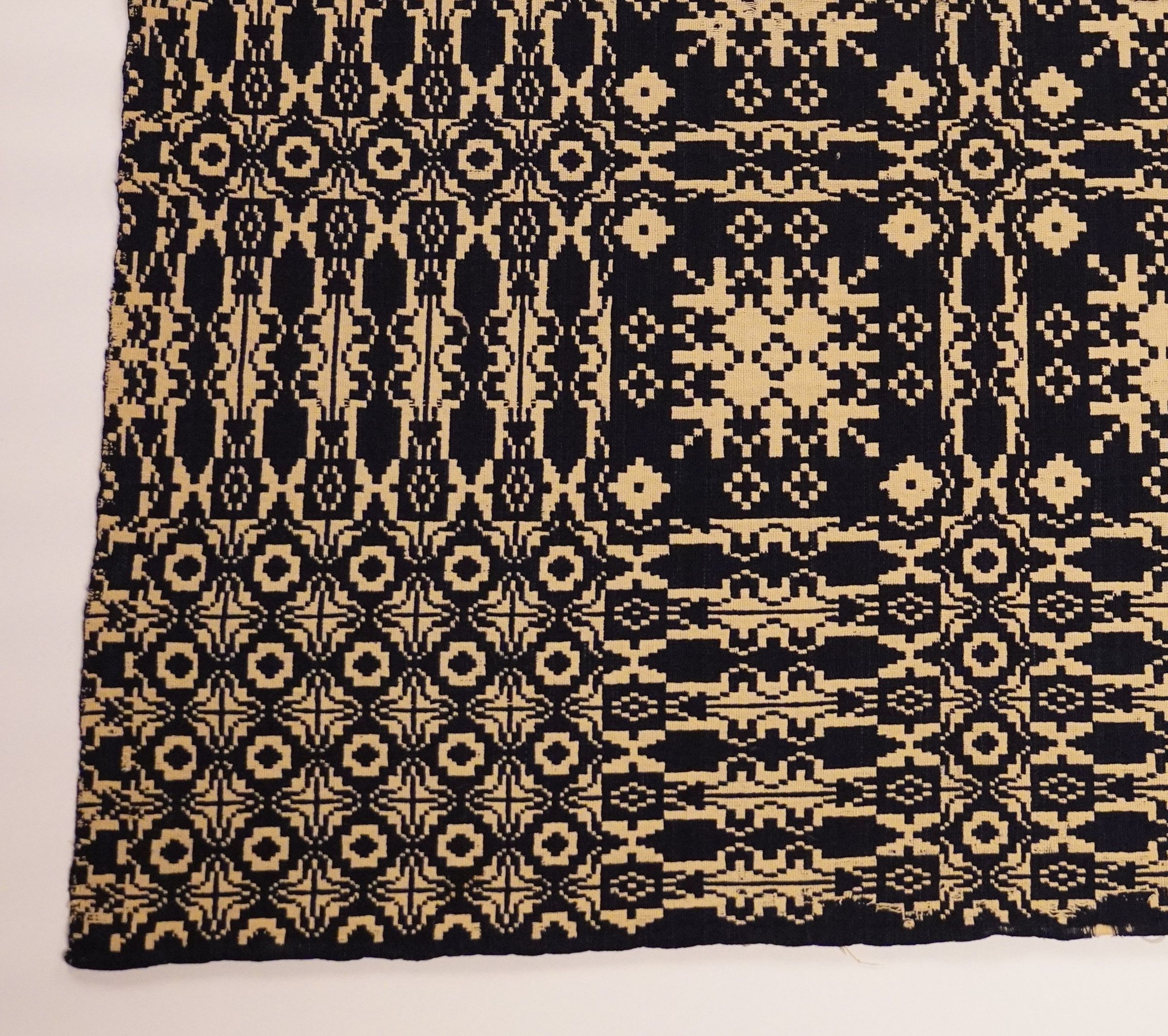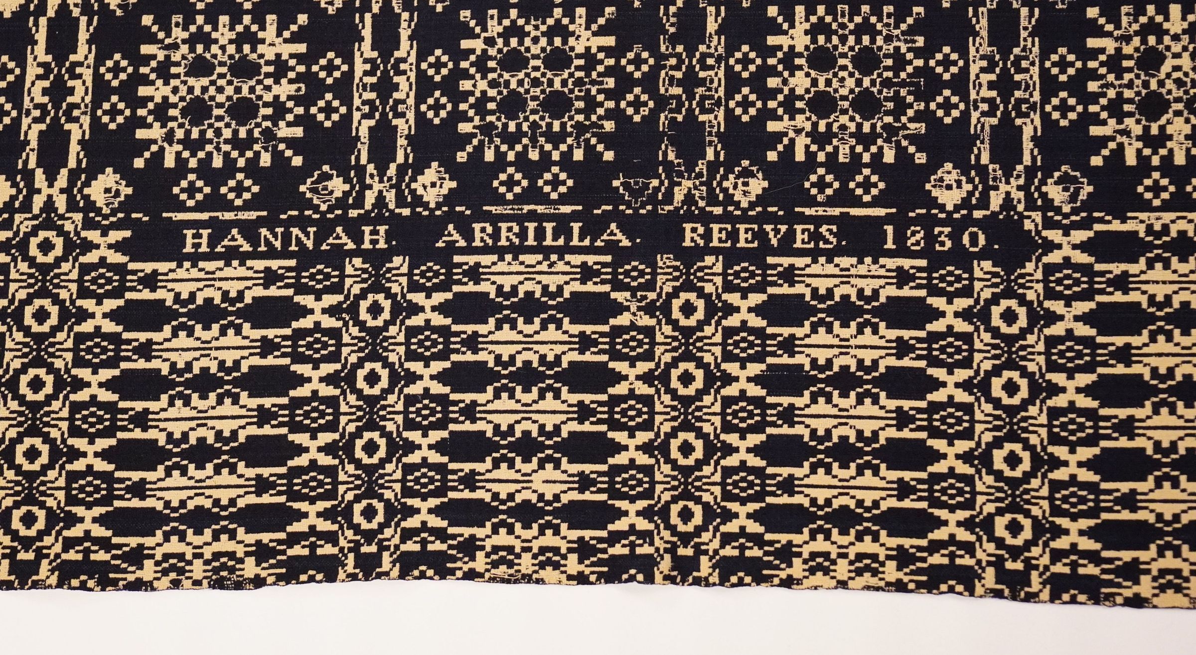 Navy and natural geometric doublecloth coverlet with border on four sides. Two joined panels. Woven for Hannah Arrilla Reeves in Palmyra, Wayne Co., New York in 1830.Collection