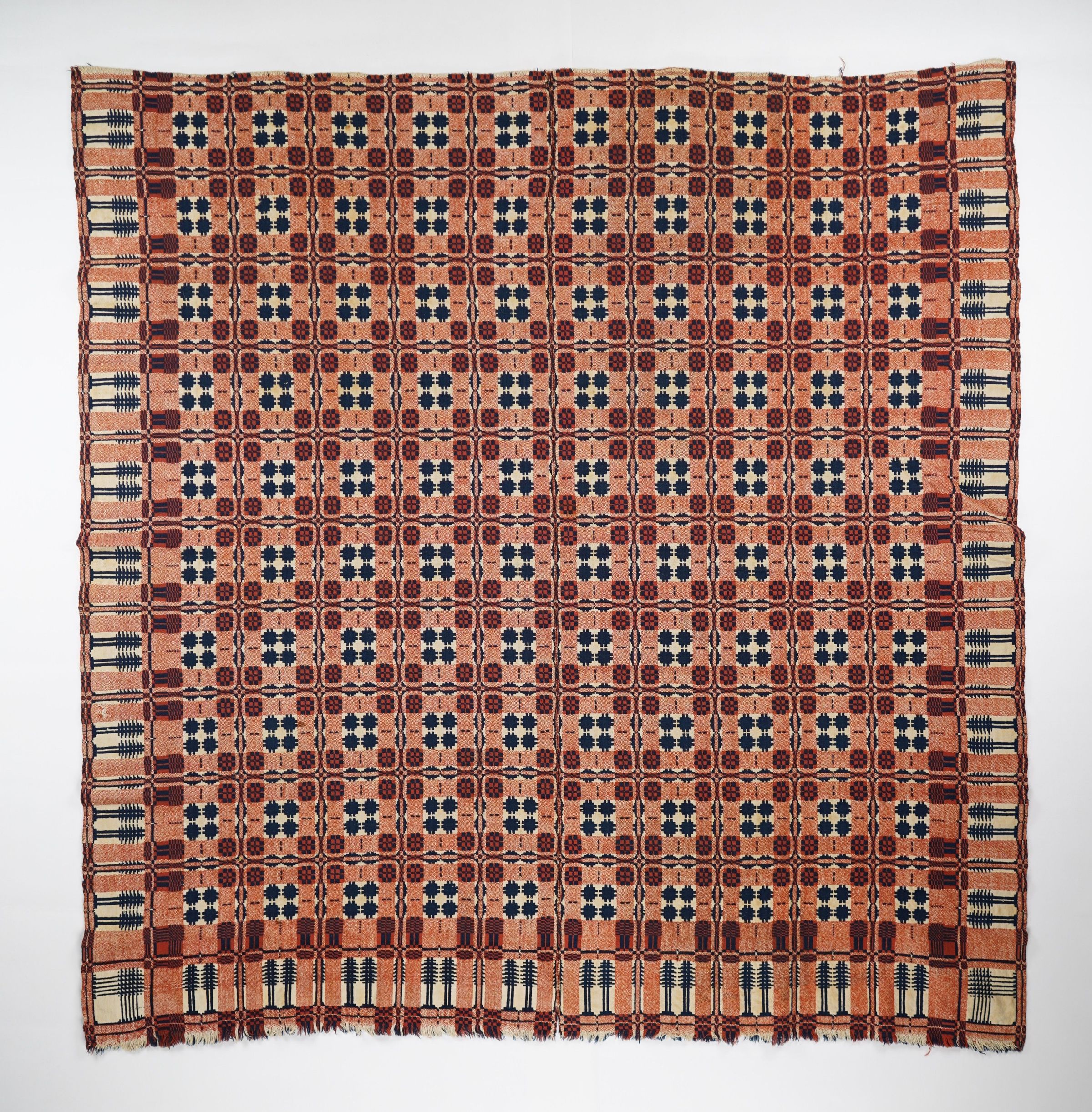Red, navy, and natural geometric doubleweave coverlet with border on three sides. Two joined panels.Context