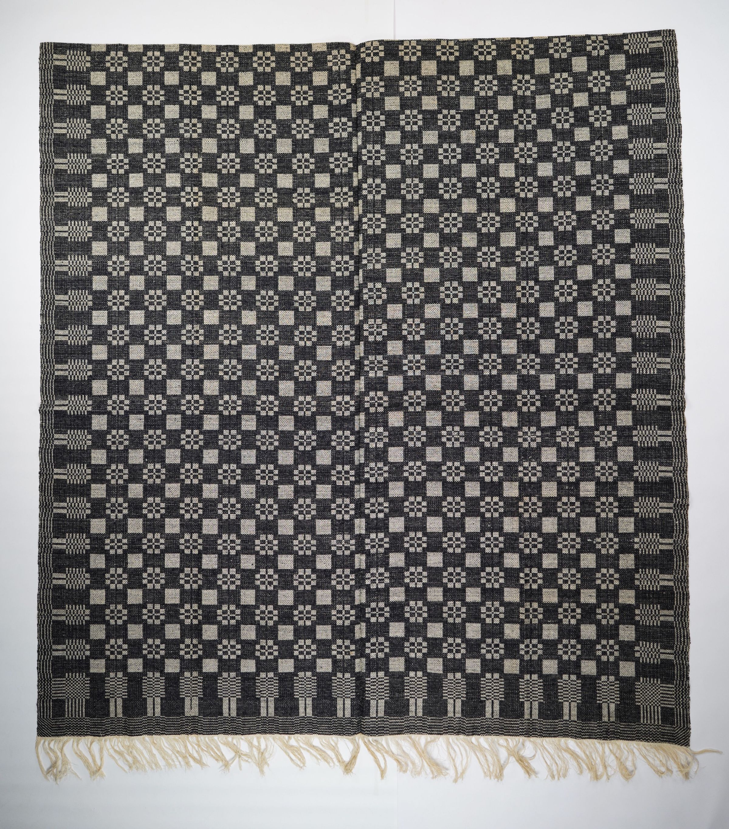 Navy and natural geometric gebrochene coverlet with border on three sides and self-fringe along bottom. Two joined panels.Collection