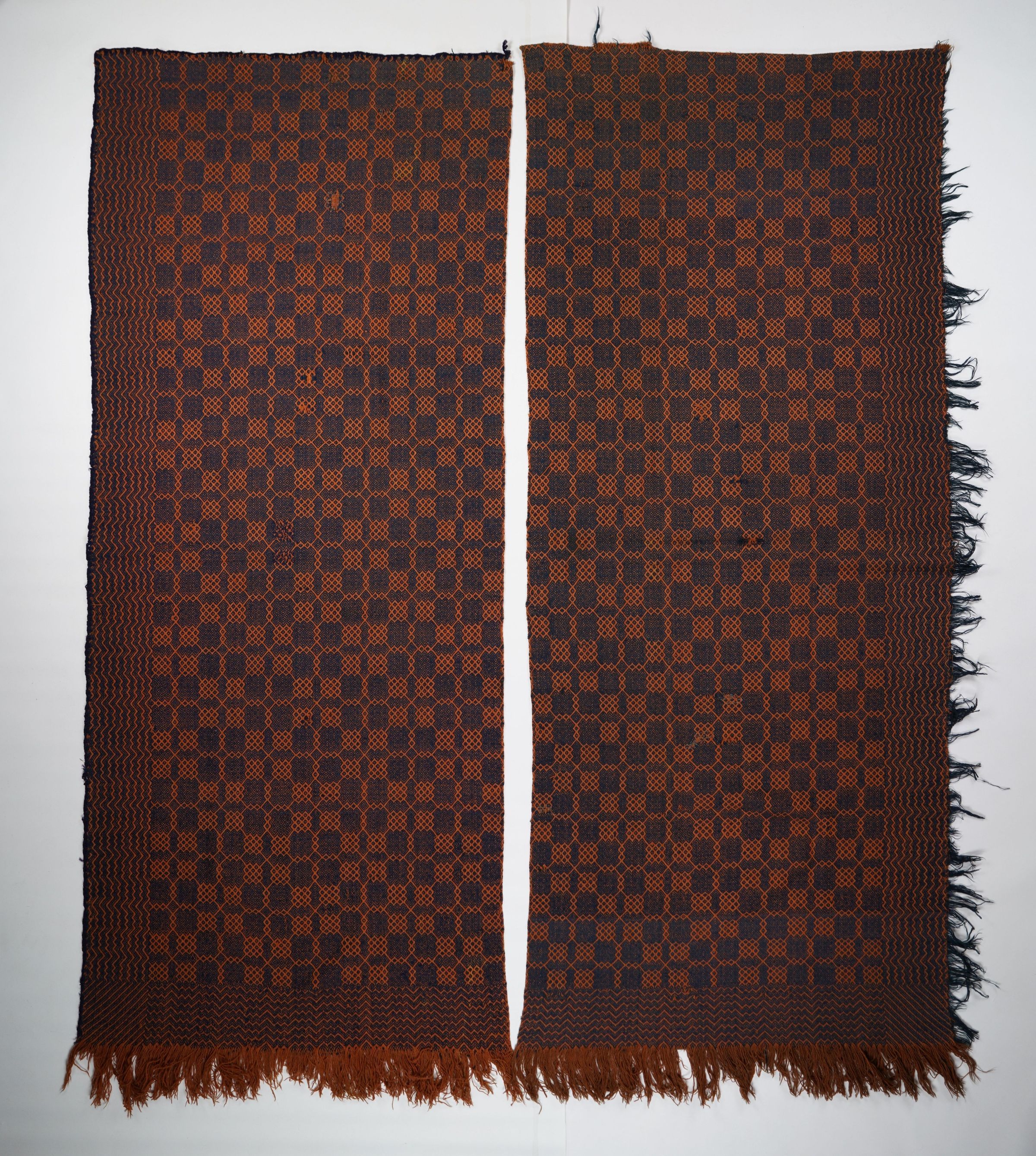 Navy and burnt sienna geometric multishaft broken twill coverlet with border on three sides and self-fringe on two sides. Two separated panels.Collection