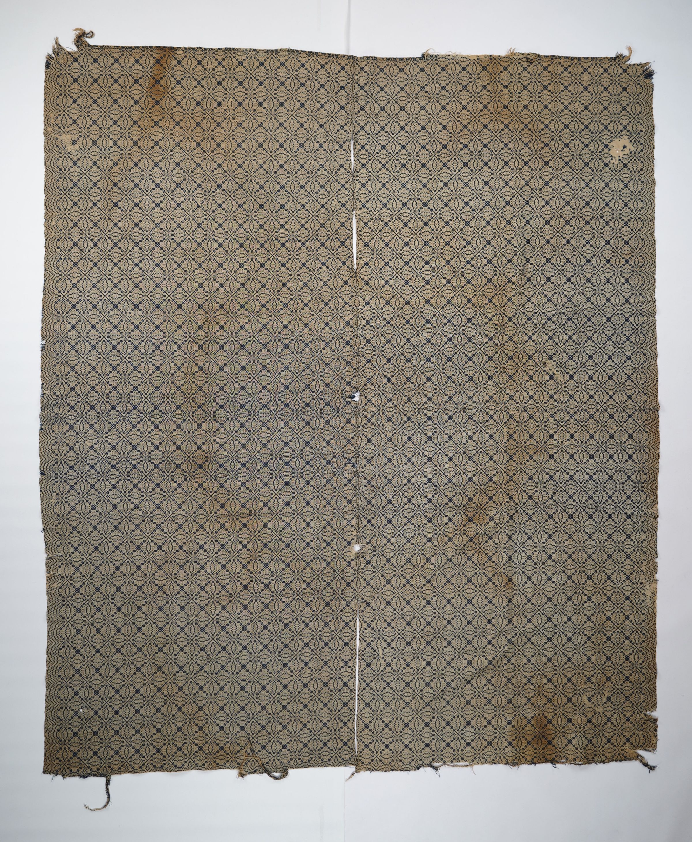 Navy and natural geometric gebrochene coverlet with border on left and right sides. Two joined panels.