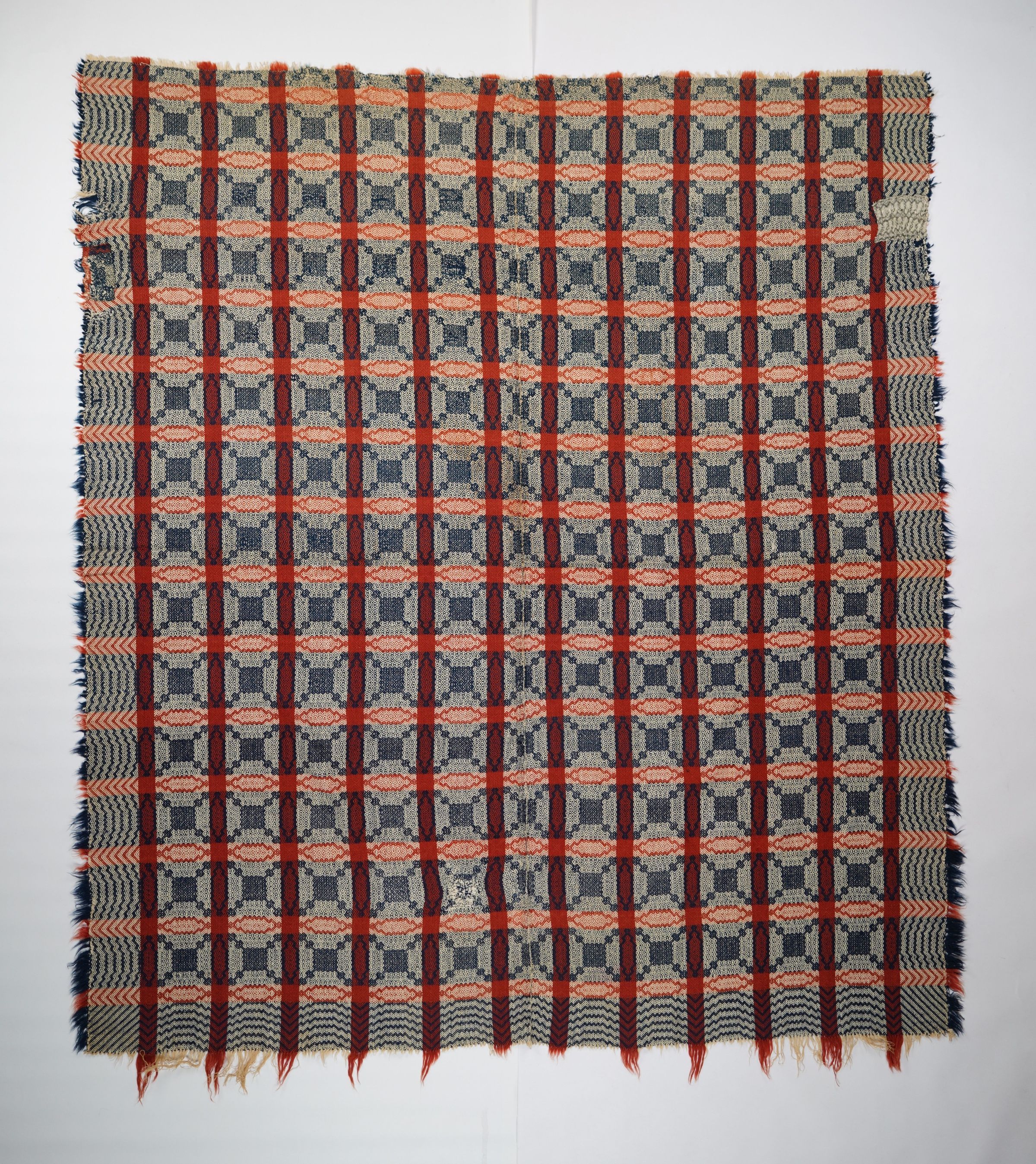 Red, navy, and natural geometric gebrochene coverlet with border on three sides. Two joined panels.
