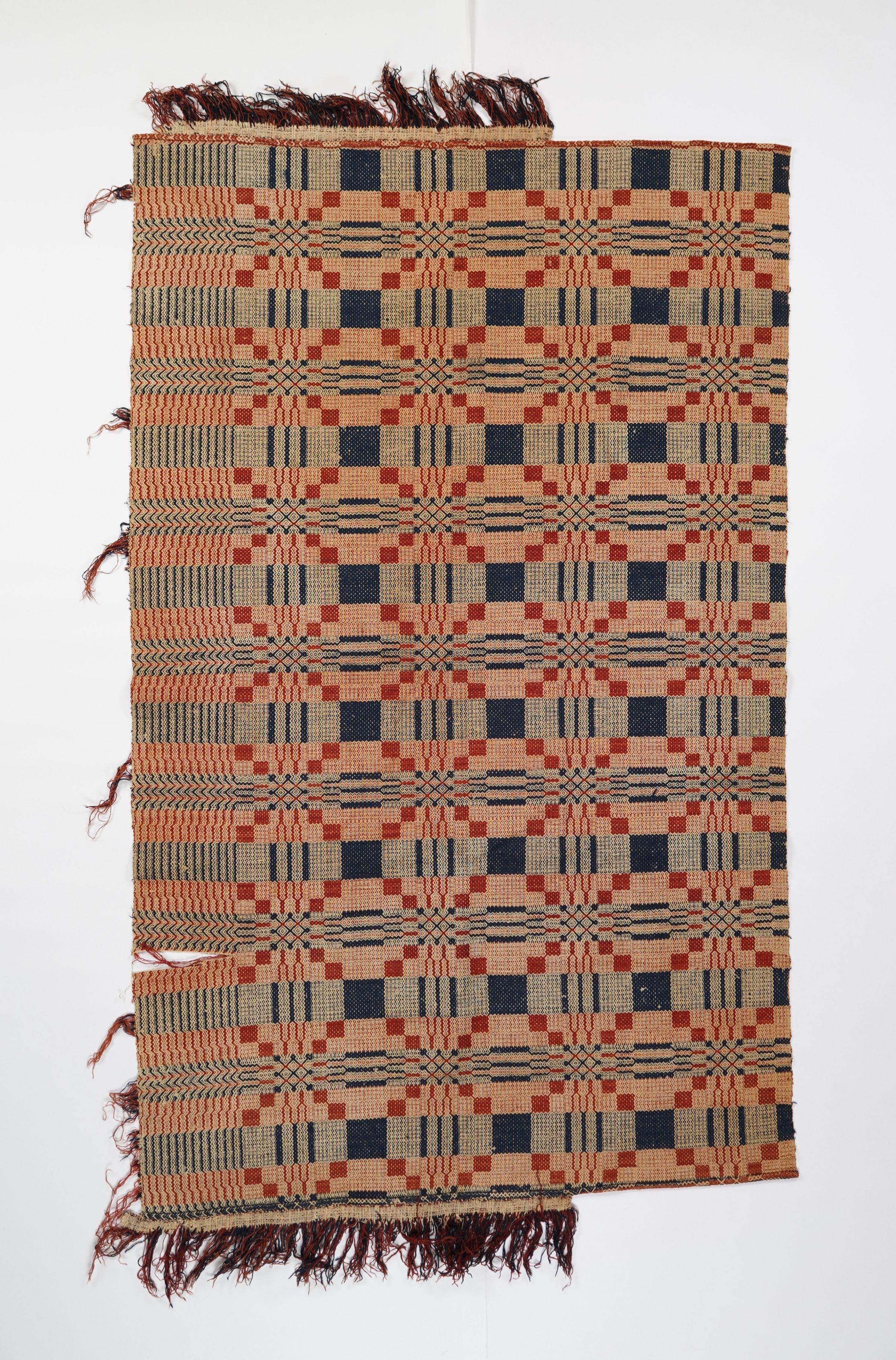 Red, navy, and natural geometric gebrochene coverlet with border on left side and applied fringe on top and bottom. Two joined panels.Collection