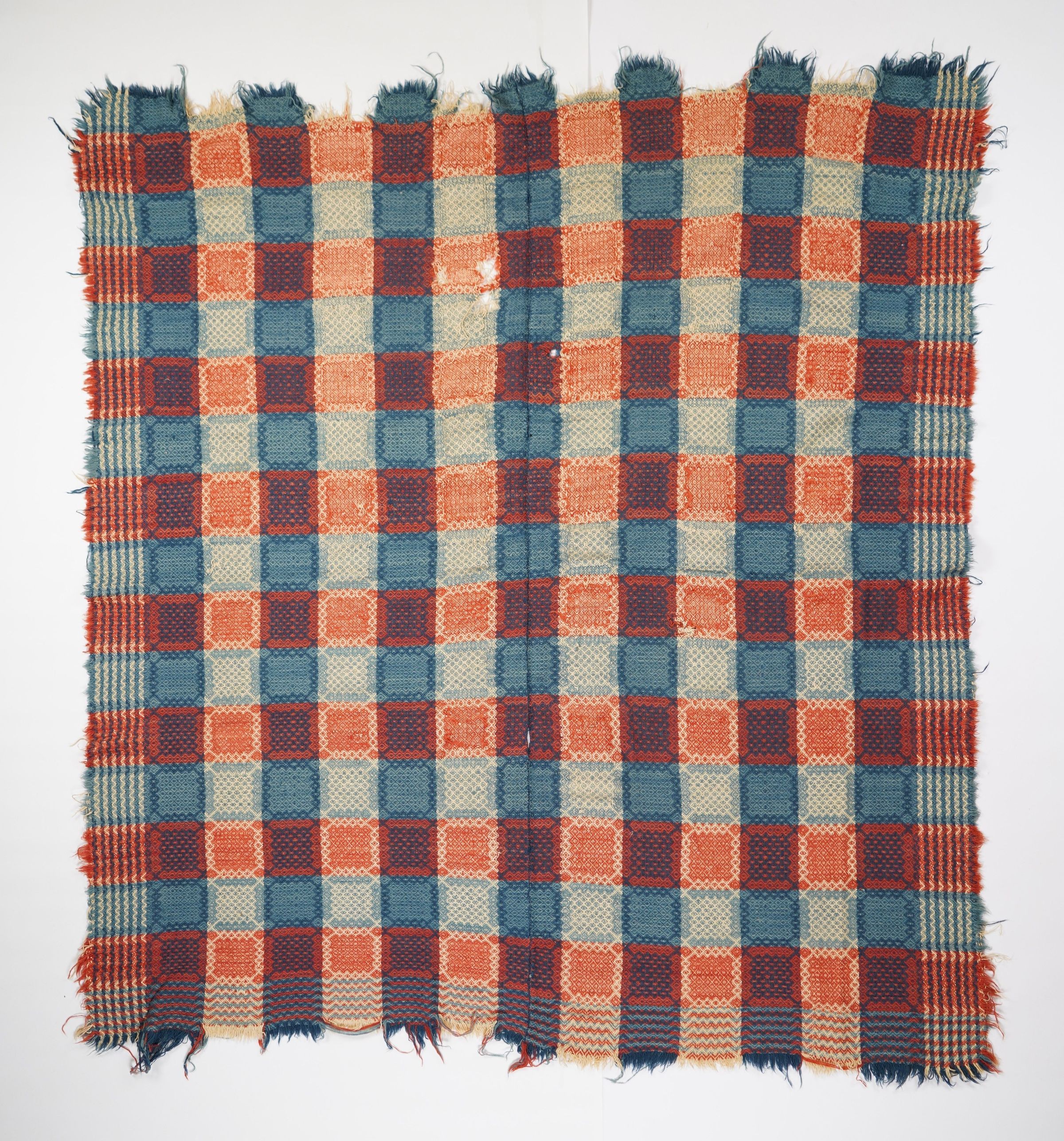 Navy, blue, red, and natural geometric gebrochene coverlet with border on three sides. Two joined panels.Collection