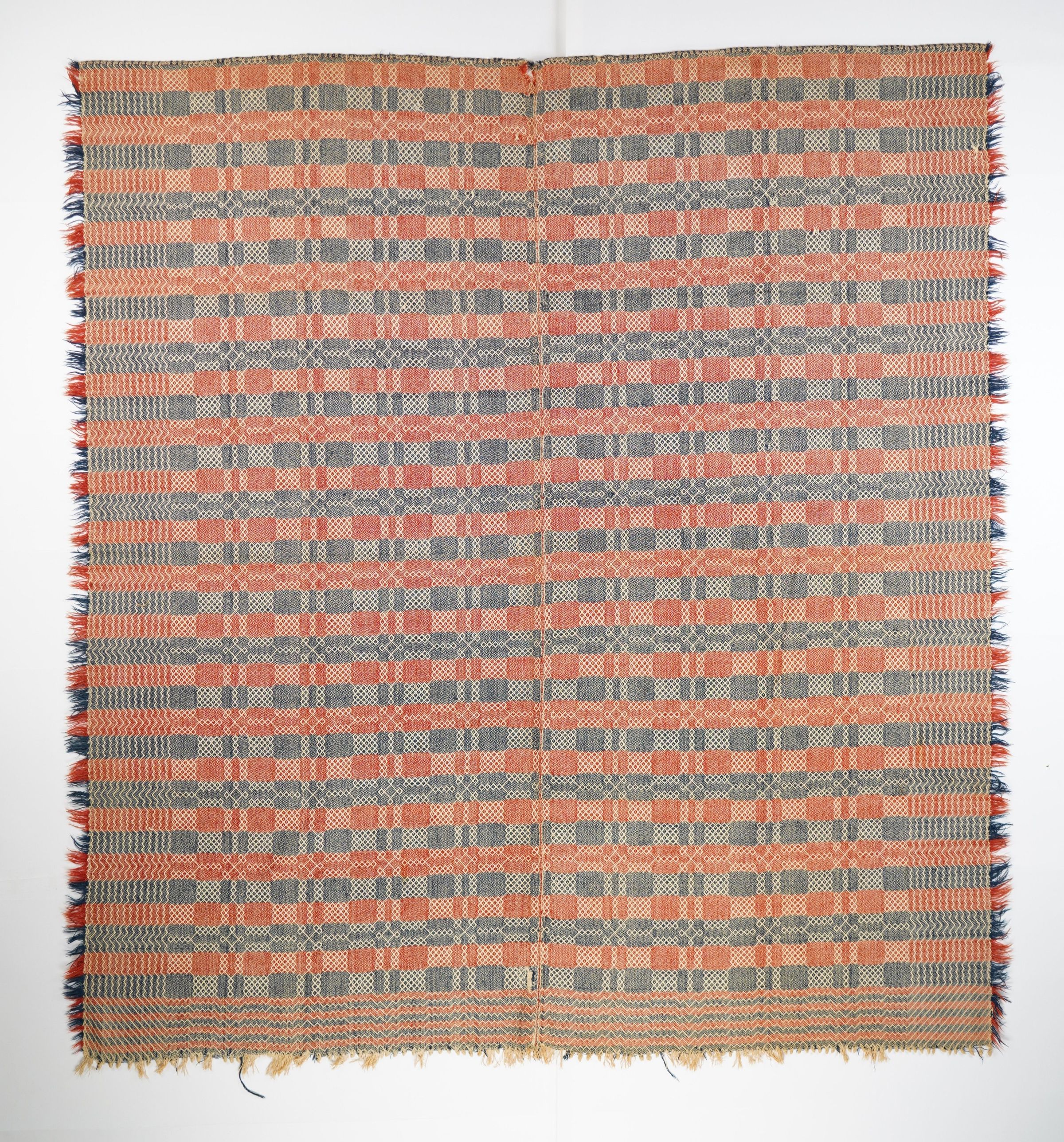 Navy, red, and natural geometric Gerbrochen twill coverlet with self fringe.