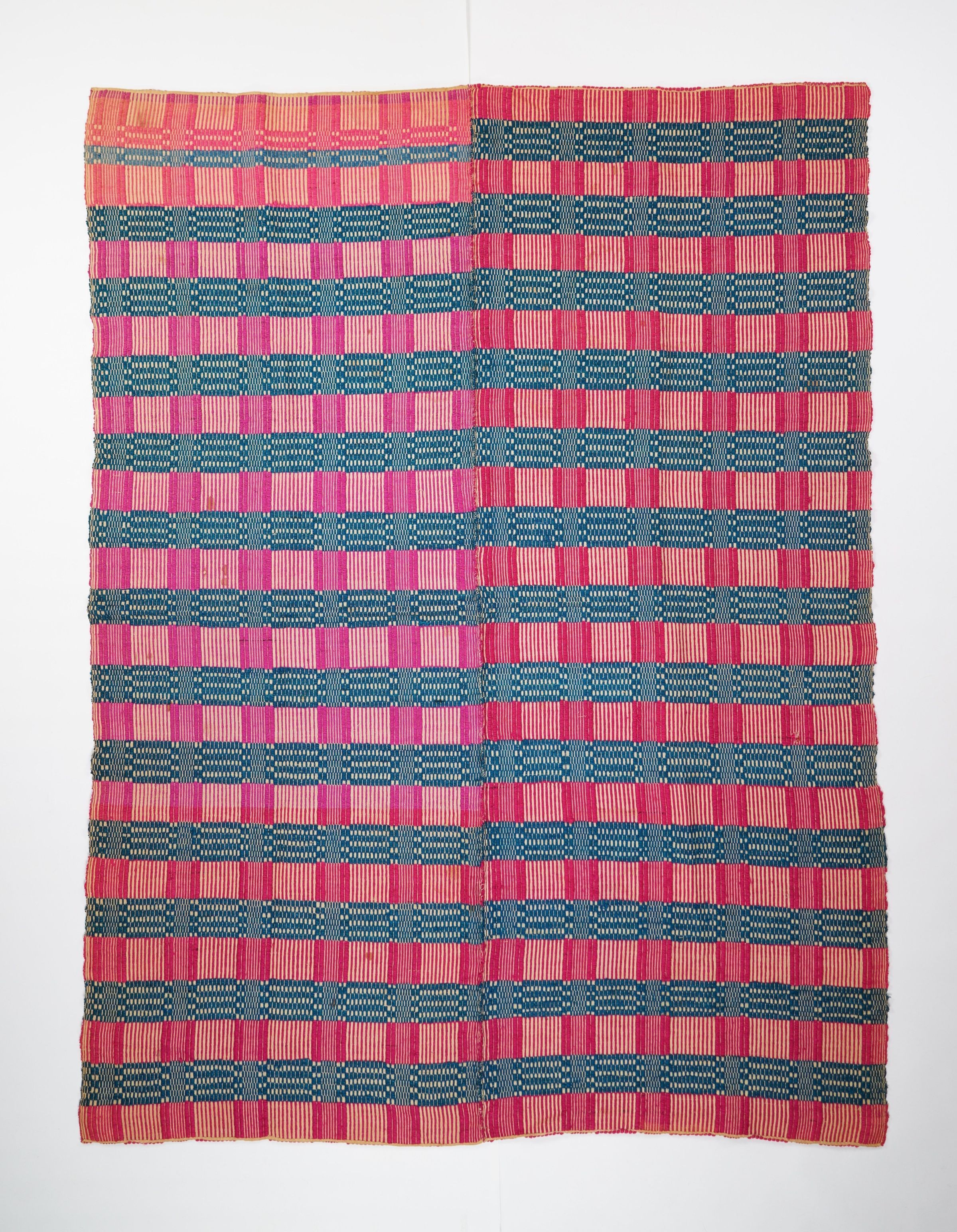 Pink, red, navy, and natural geometric monk's belt coverlet. Two joined panels. Note the two shades of pink and the color runout in the upper left.Collection