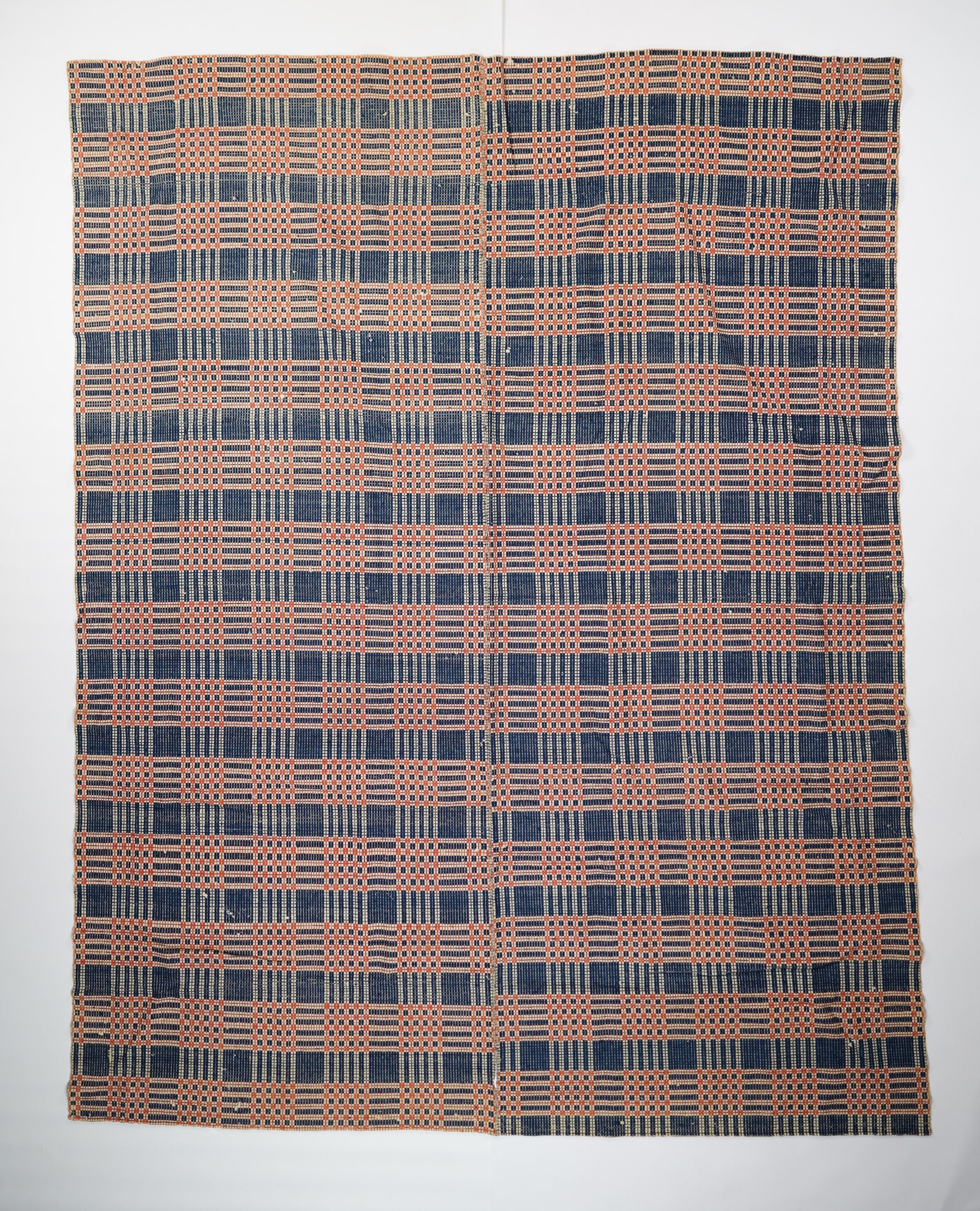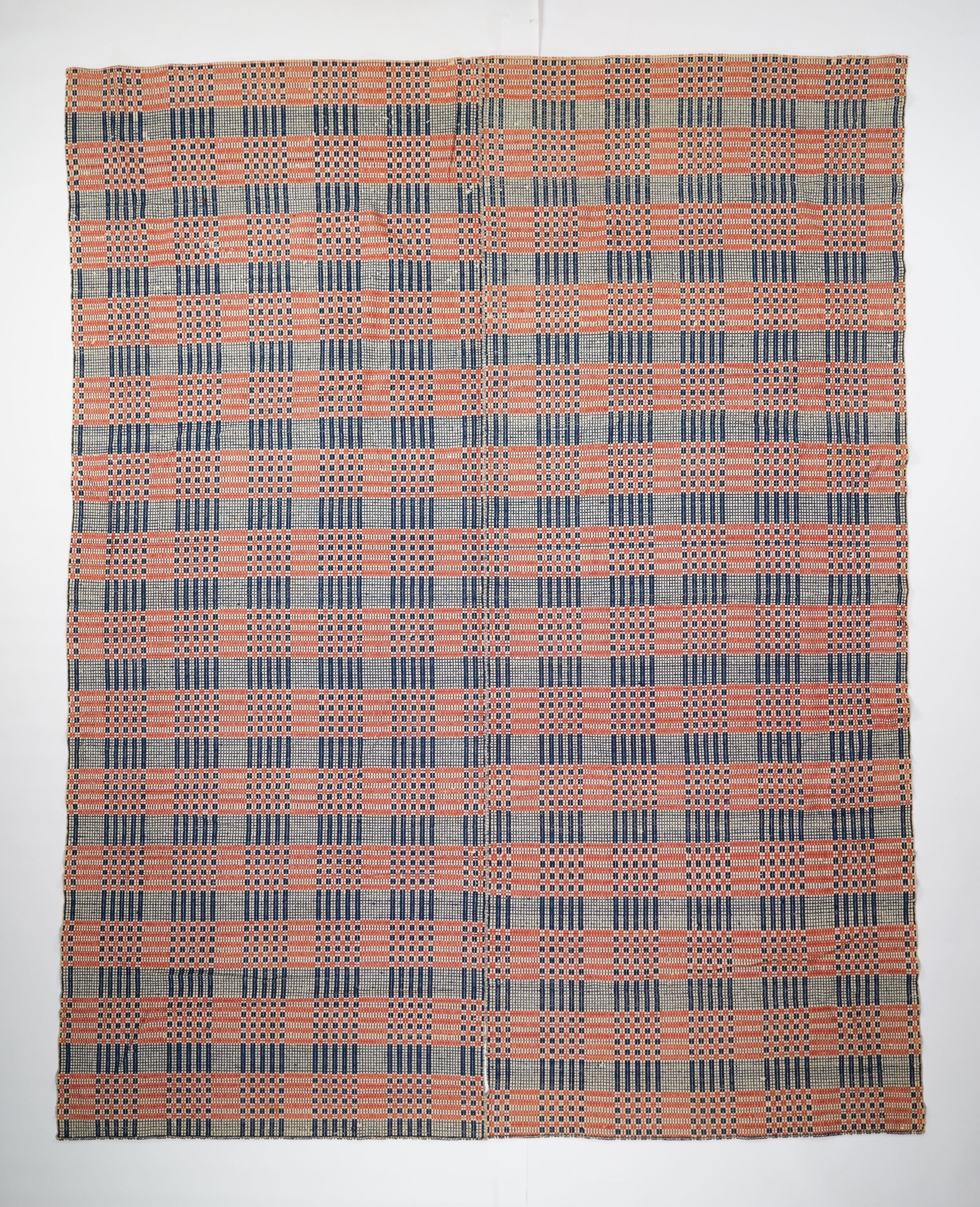 Red, navy, and natural geometric double weave coverlet. Two joined panels.