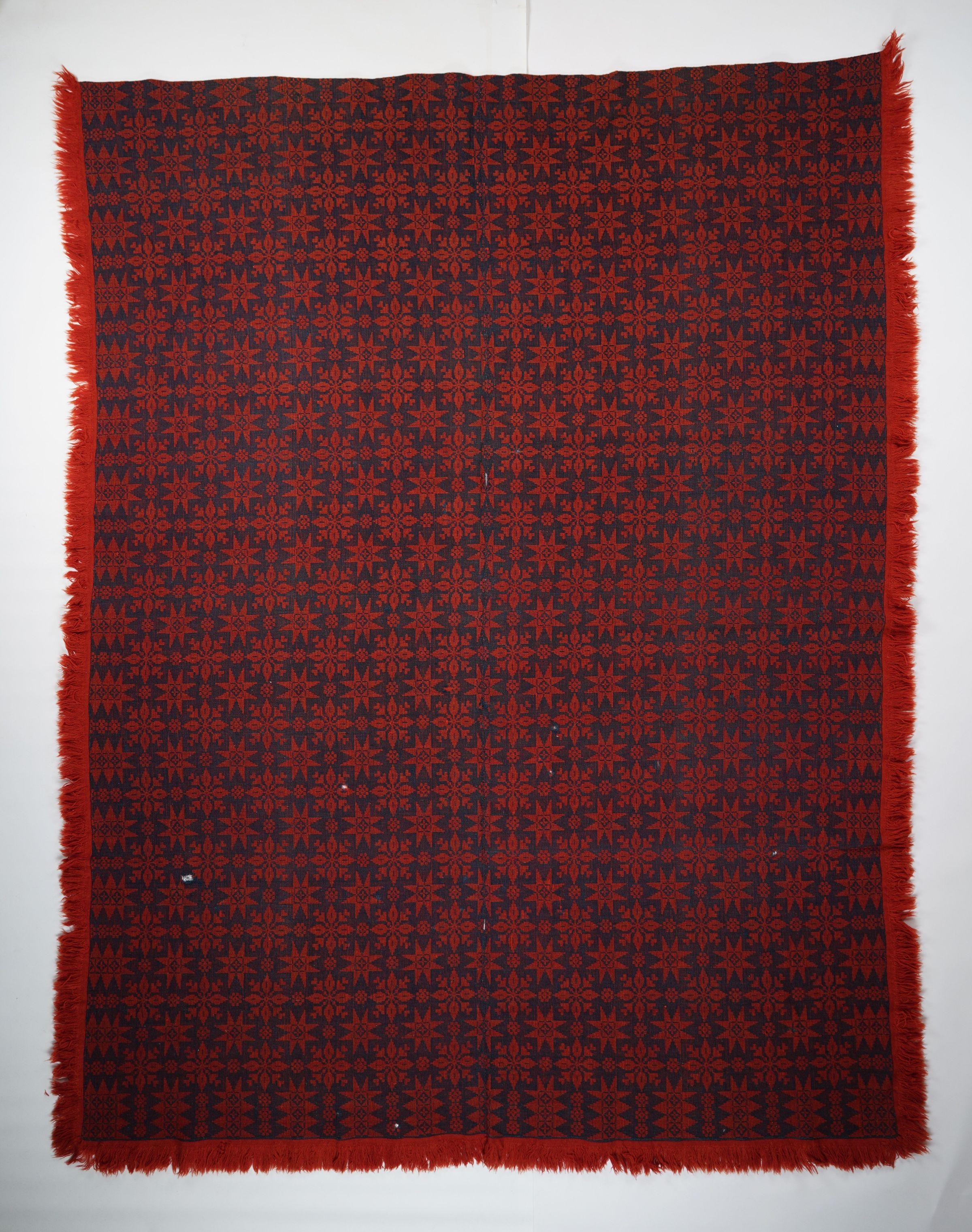 Red and navy geometric coverlet with border and applied fringe on three sides. Two joined panels.