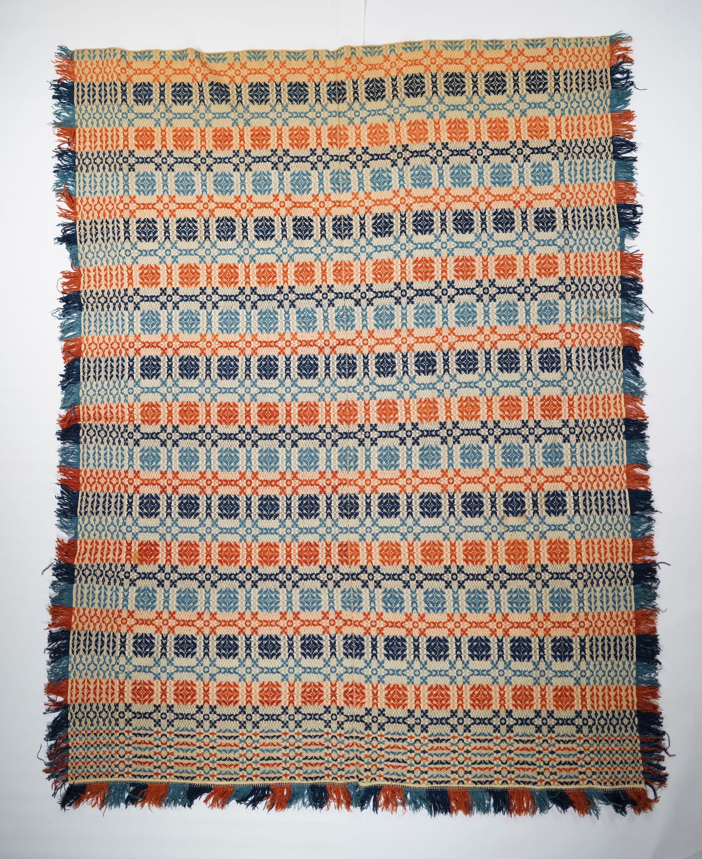 Navy, blue, red, and natural geometric coverlet with border on three sides, self-fringe on left and right sides, and applied fringe along bottom. Two joined panels.Collection
