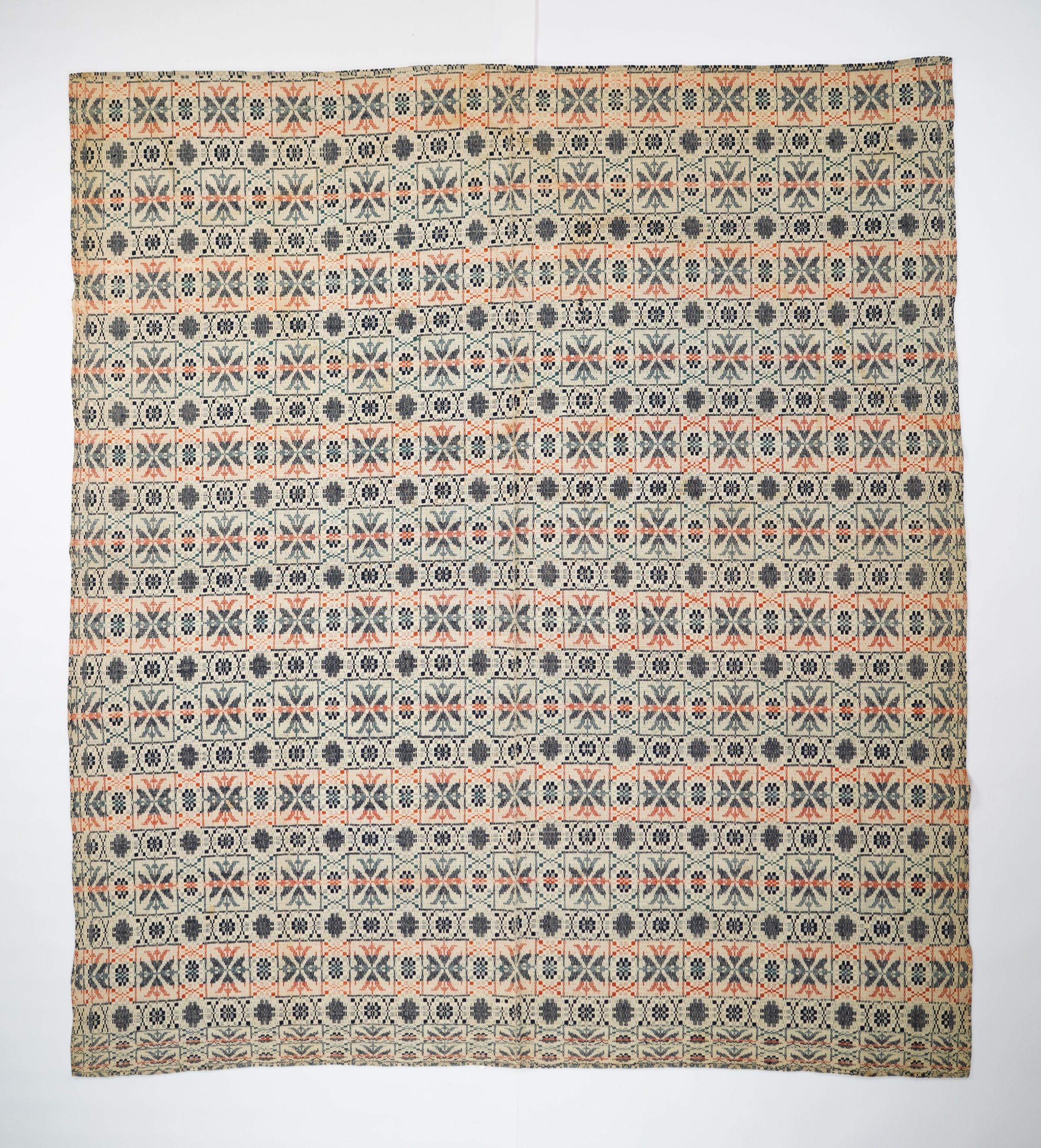 Red, blue, navy, and natural geometric floatwork coverlet with border on three sides.Collection
