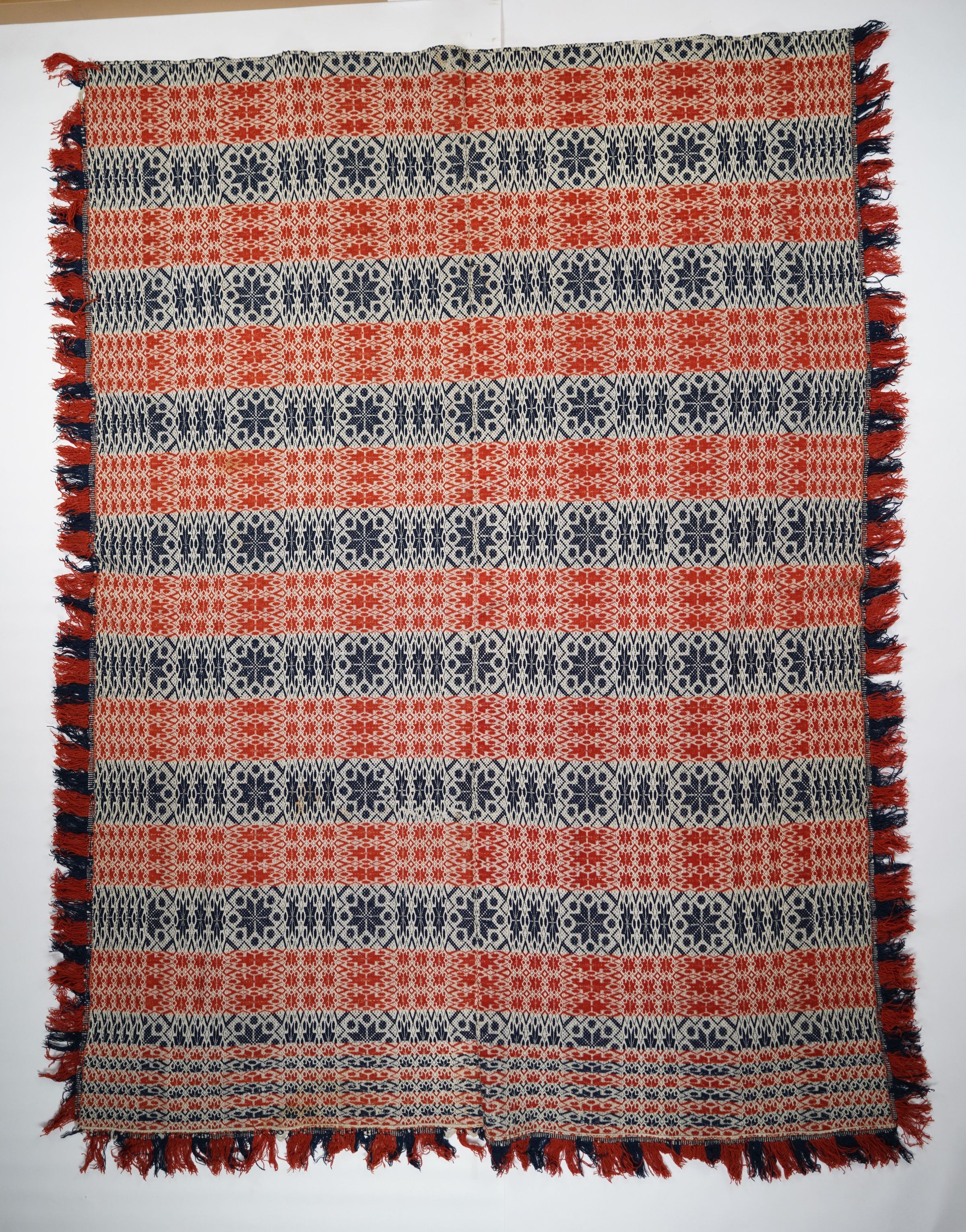 Red, navy, and natural geometric coverlet with border and applied fringe on three sides. Two joined panelsCollection