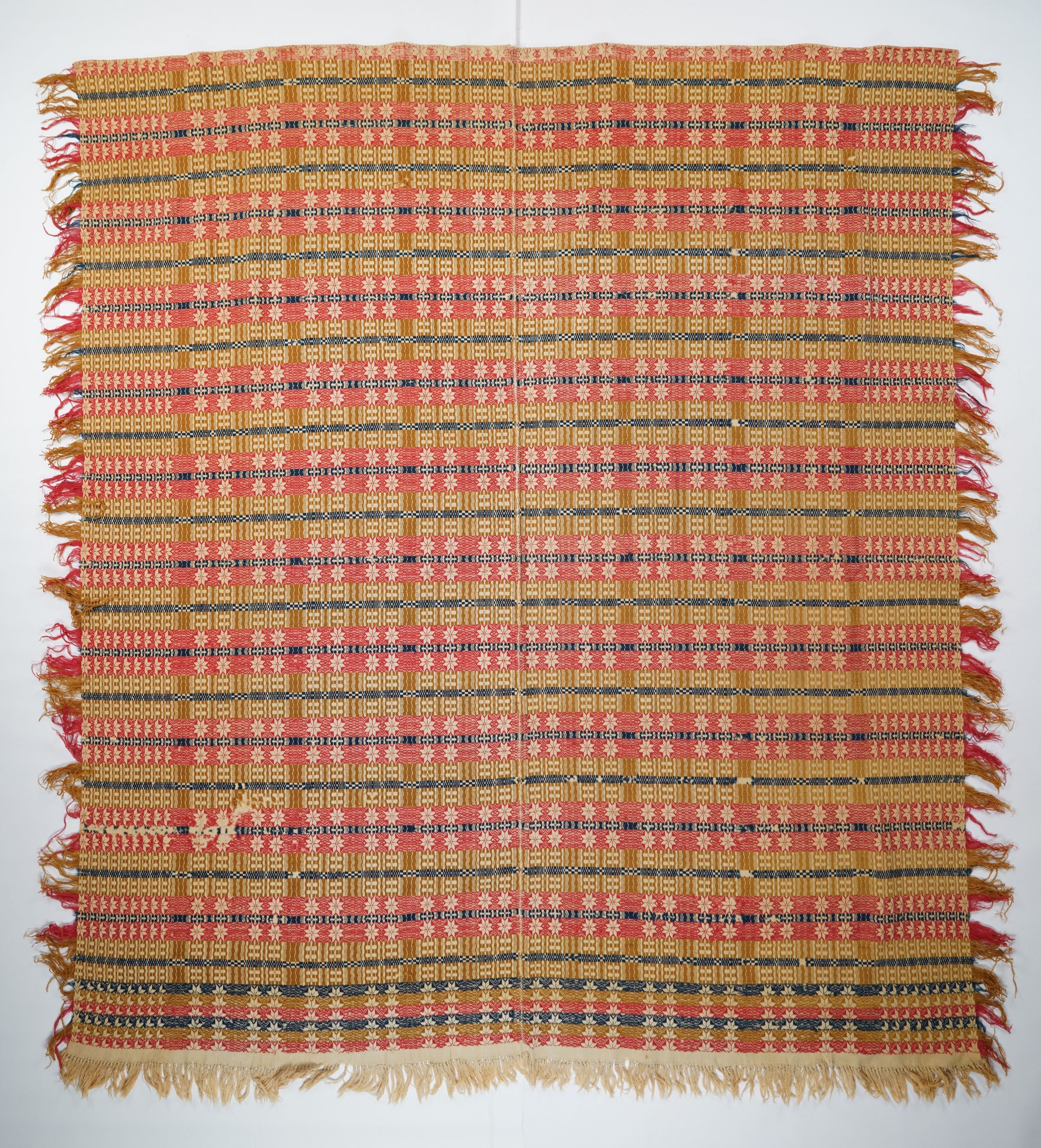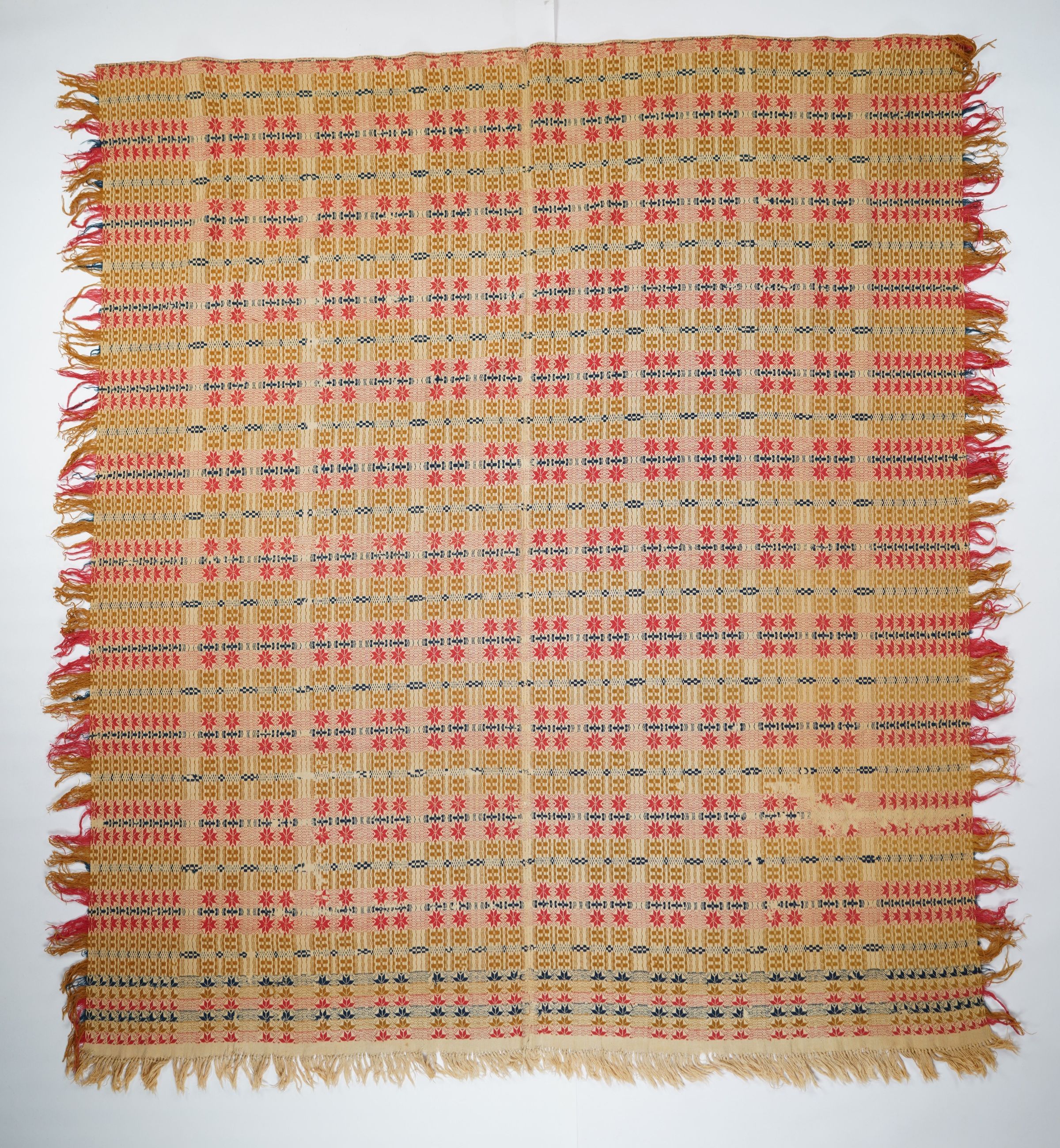 Red, burnt sienna, navy, and natural geometric coverlet with border and self-fringe on three sides. Two joined panels.Collection