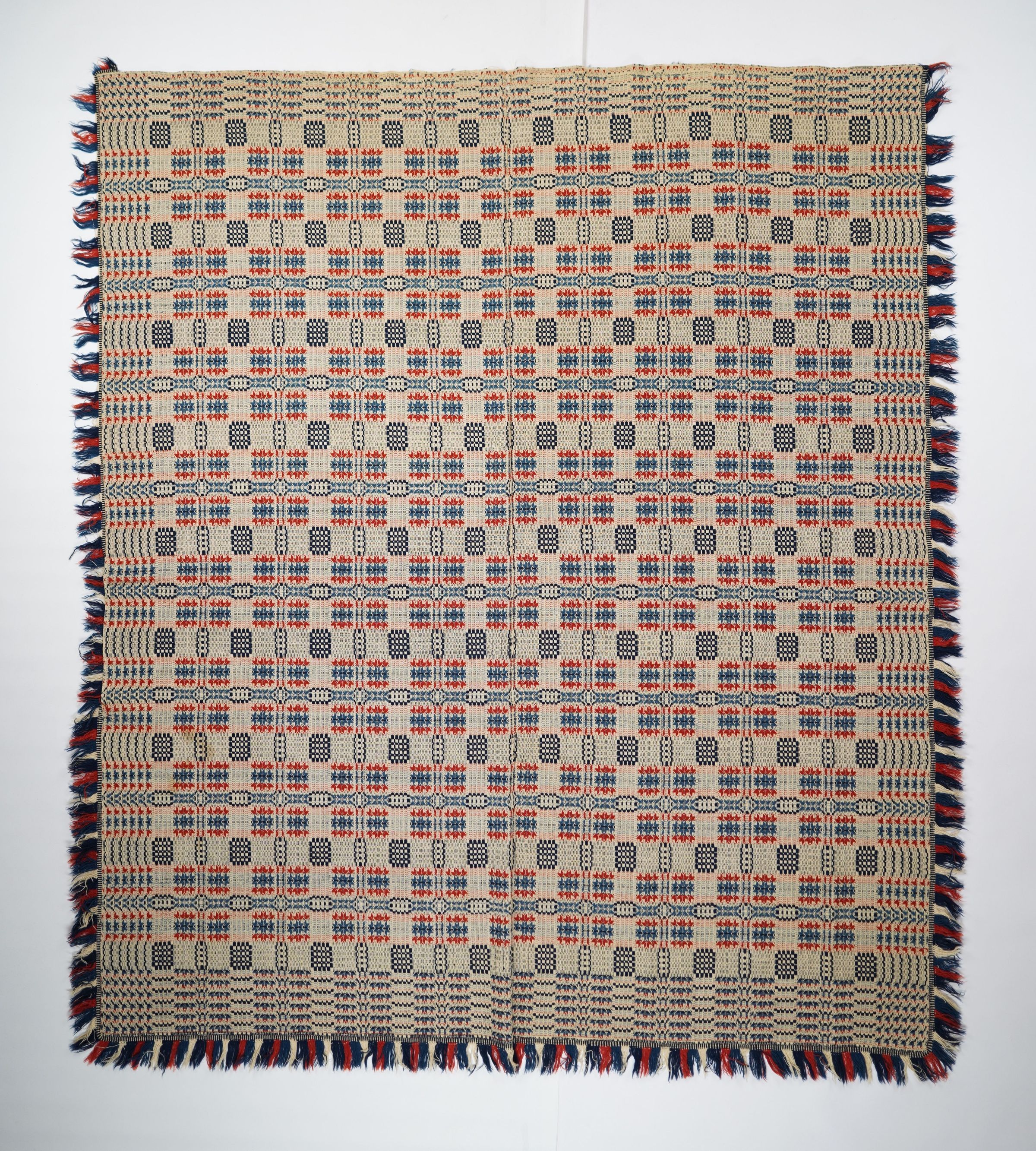 Red, blue, navy and natural geometric coverlet with border on four sides and applied fringe on three sides. Two joined panels.Collection