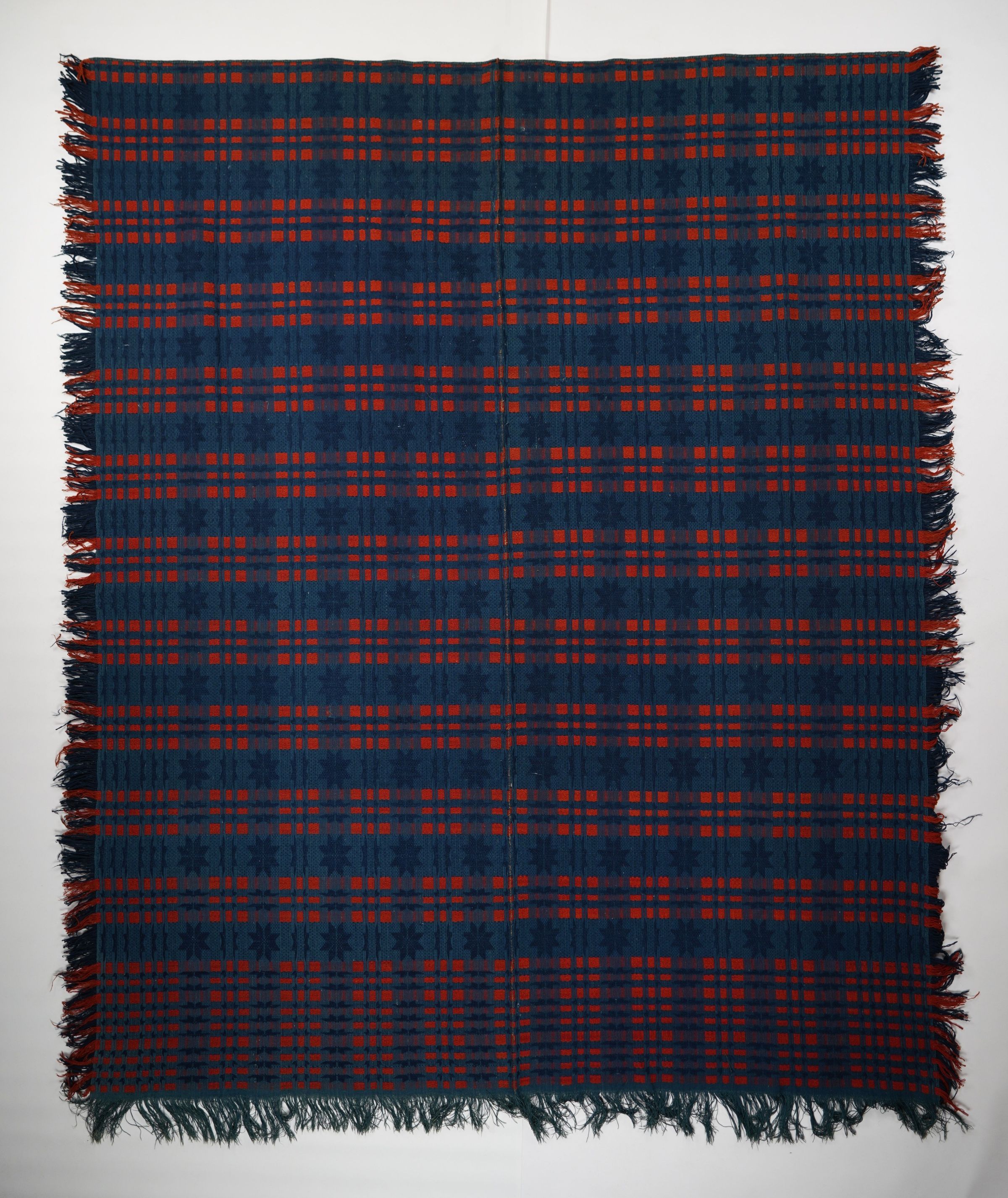Red, blue, and navy geometric coverlet with border and self-fringe on three sides. Two joined panels.Collection