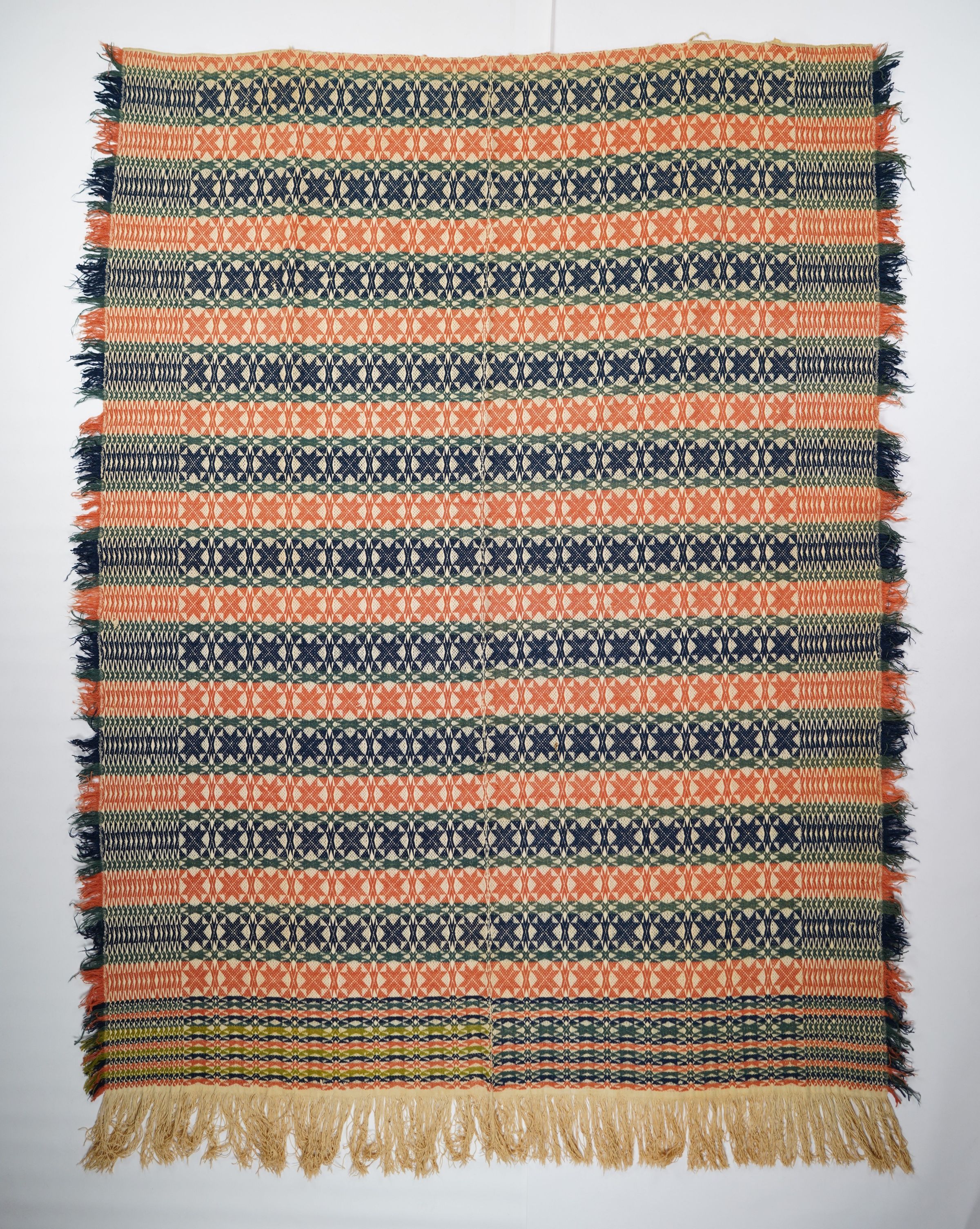 Red, navy, green, blue/green, and natural geometric starwork coverlet with border and self-fringe on three sides. Two joined panels.Collection