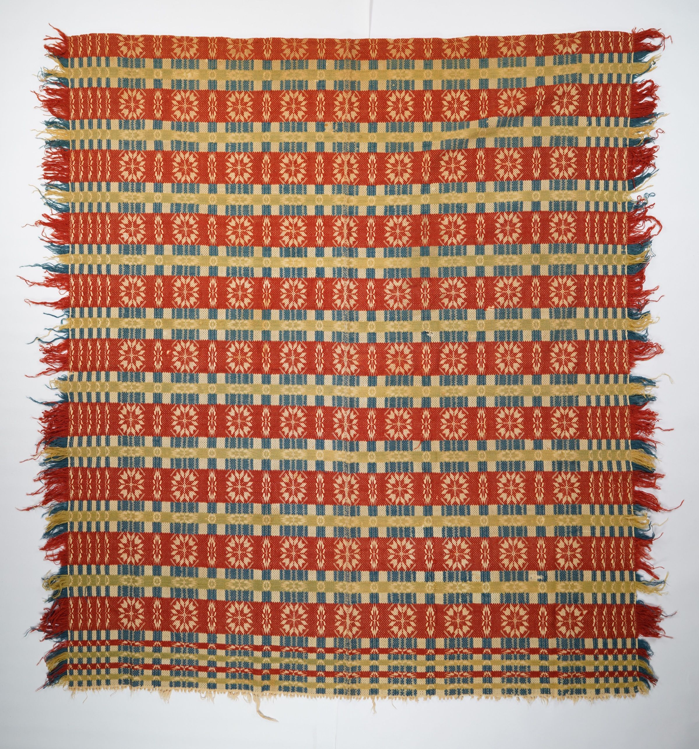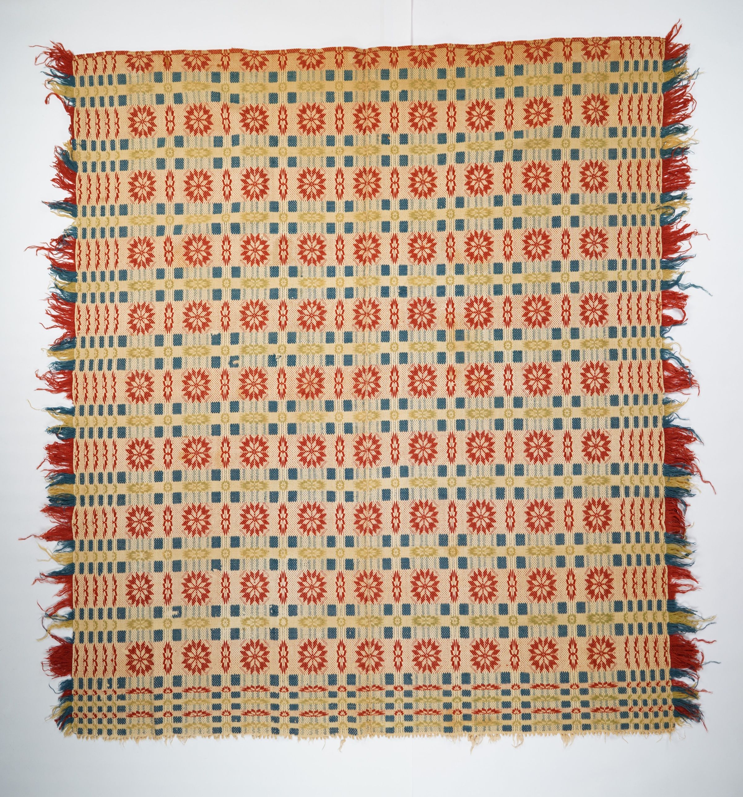 Red, green, blue, and natural geometric starwork coverlet with border and self-fringe on three sides. Two joined panelsCollection