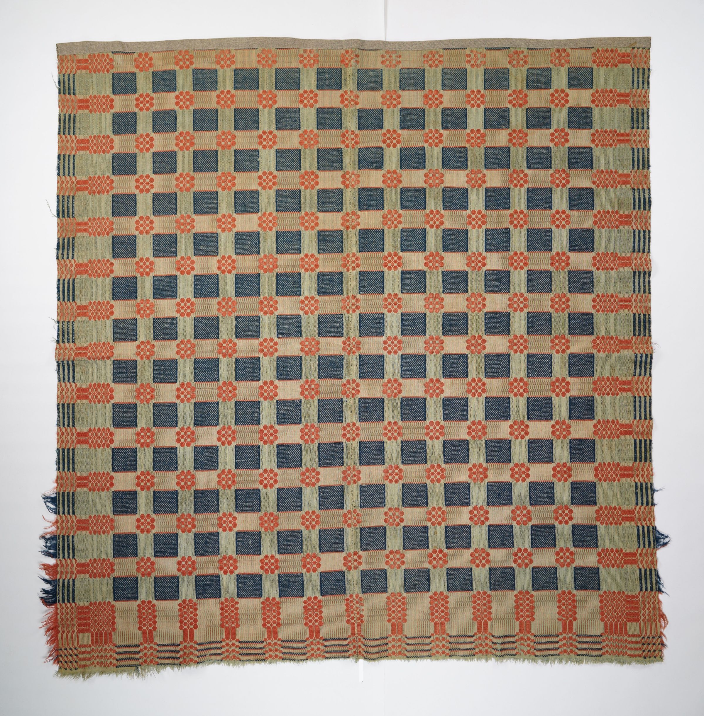 Red, navy, and natural geometric coverlet with border and self-fringe remnants on three sides. Two joined panels.Collection