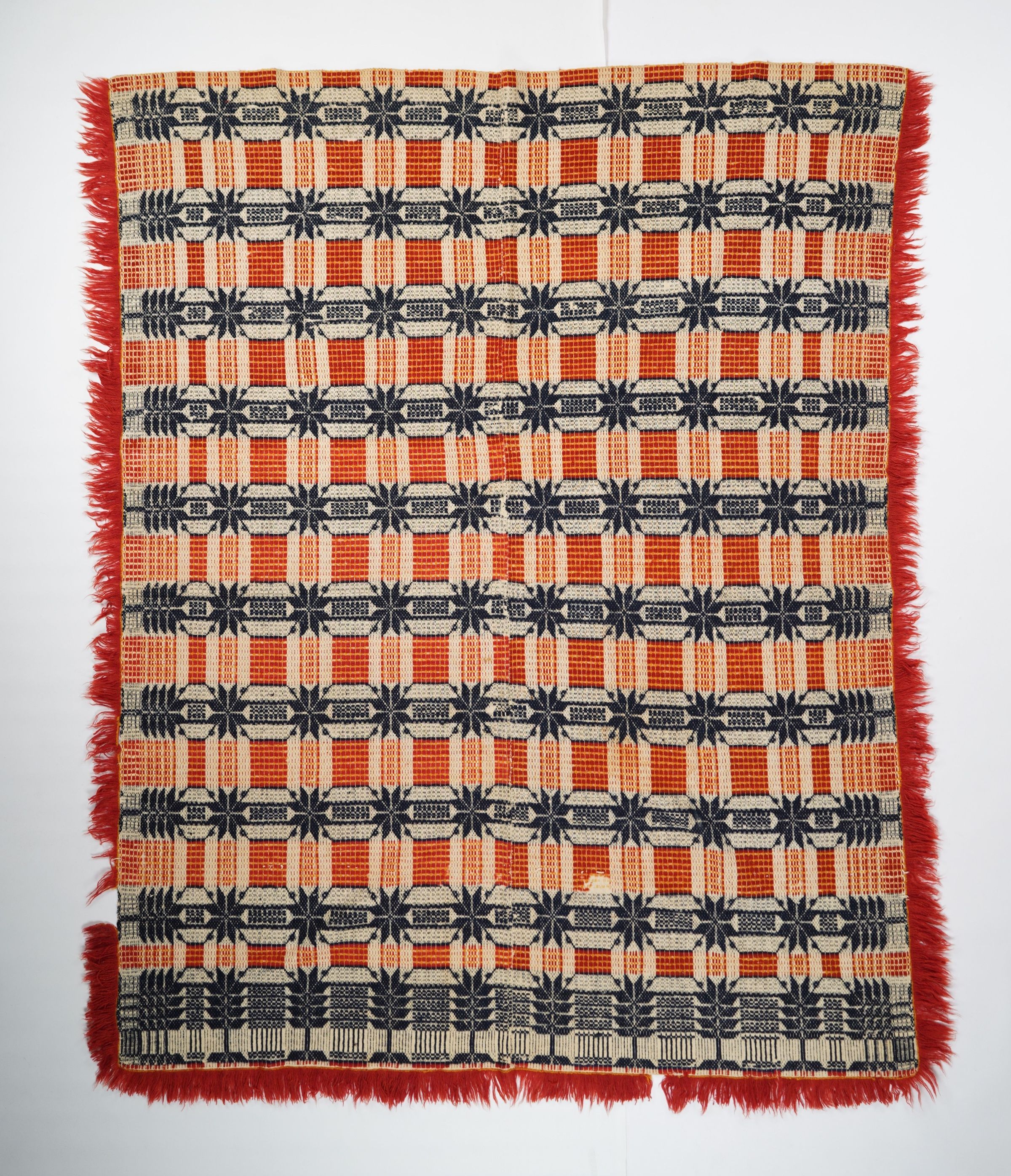 Red, navy, orange, and natural geometric coverlet with border and applied fringe on three sides. Two joined panels.Collection