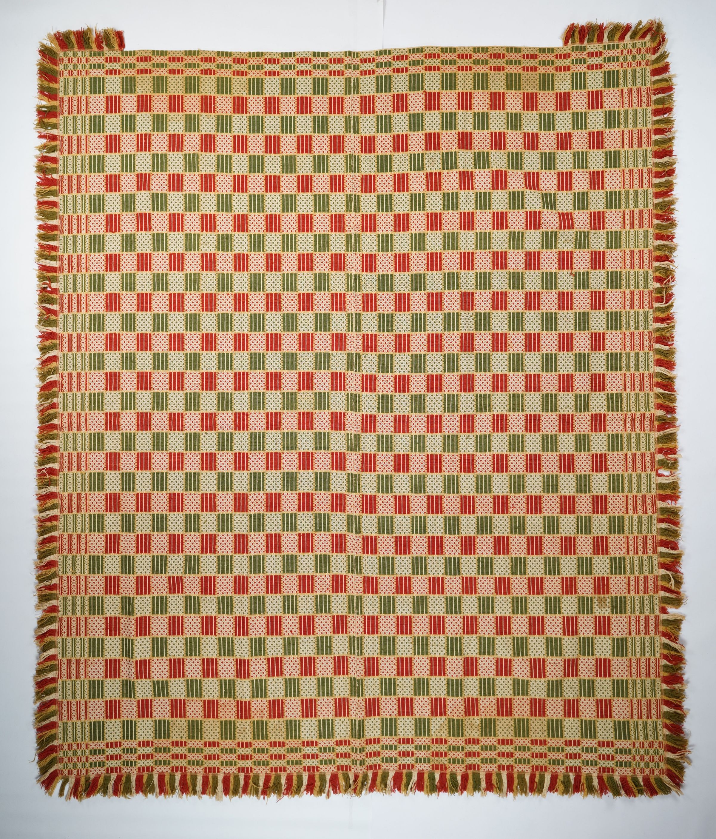 Green, red, yellow, and natural geometric coverlet with border and self-fringe on all four sides. Two joined panels.Collection