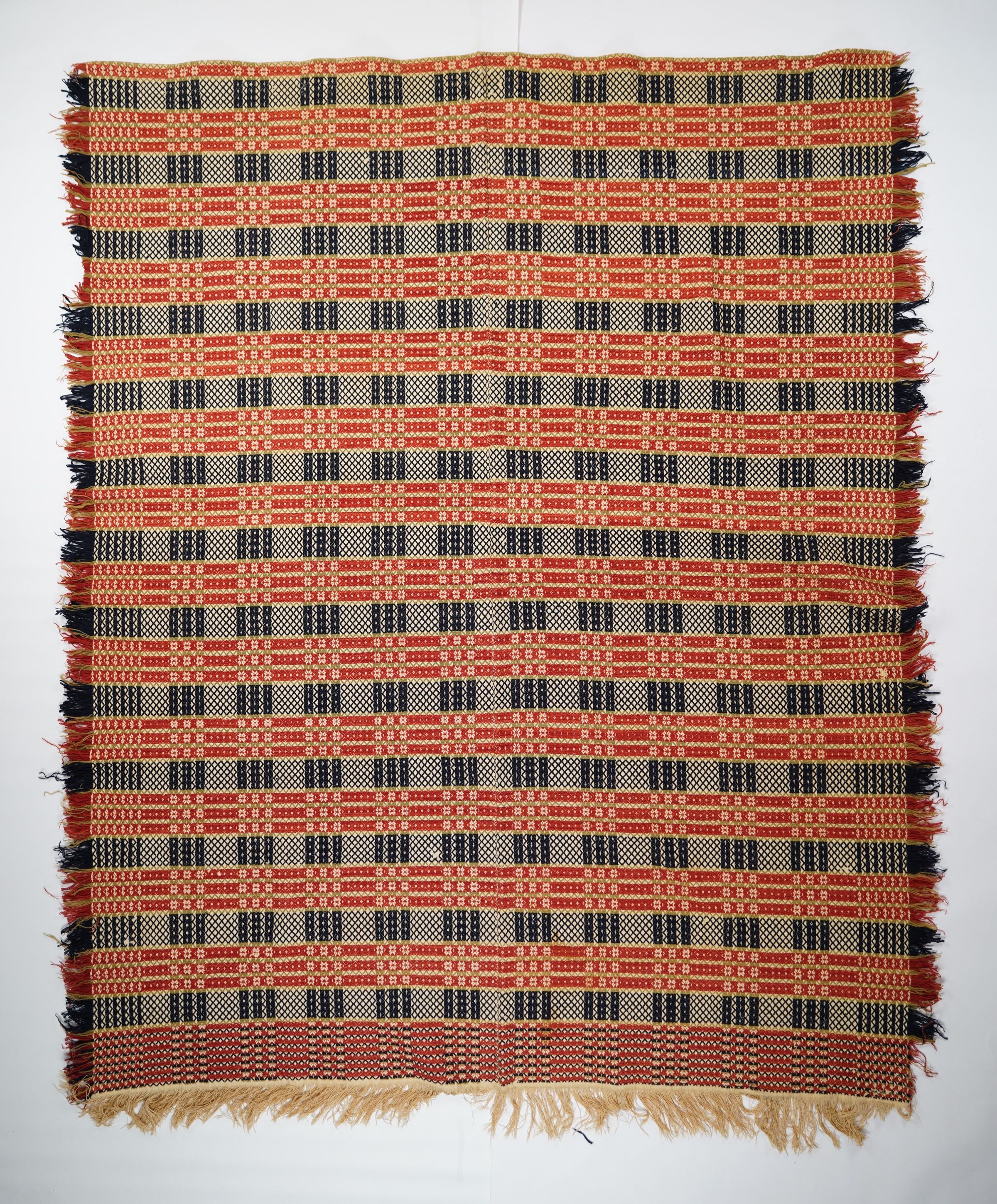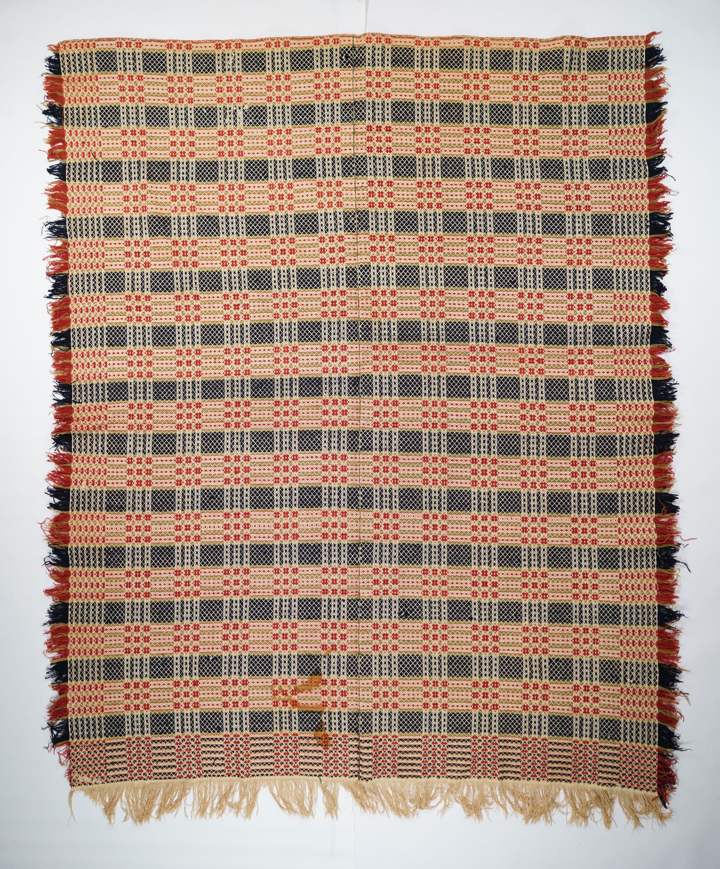 Red, green, navy, and natural geometric point twill coverlet with border and self-fringe on three sides. Two joined panels.Collection