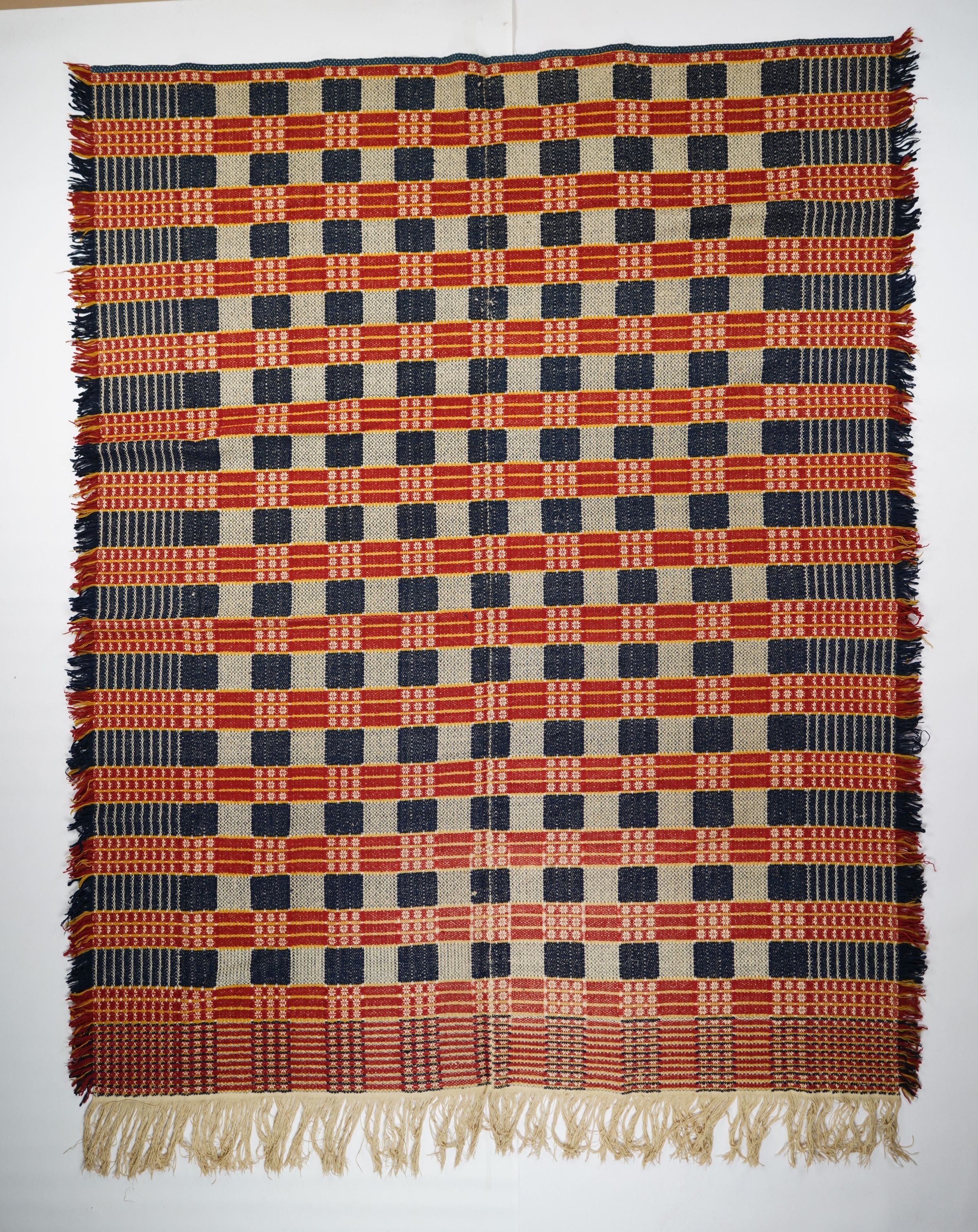 Red, navy, yellow, and natural geometric coverlet with border and self-fringe on three sides. Two joined panels.Collection