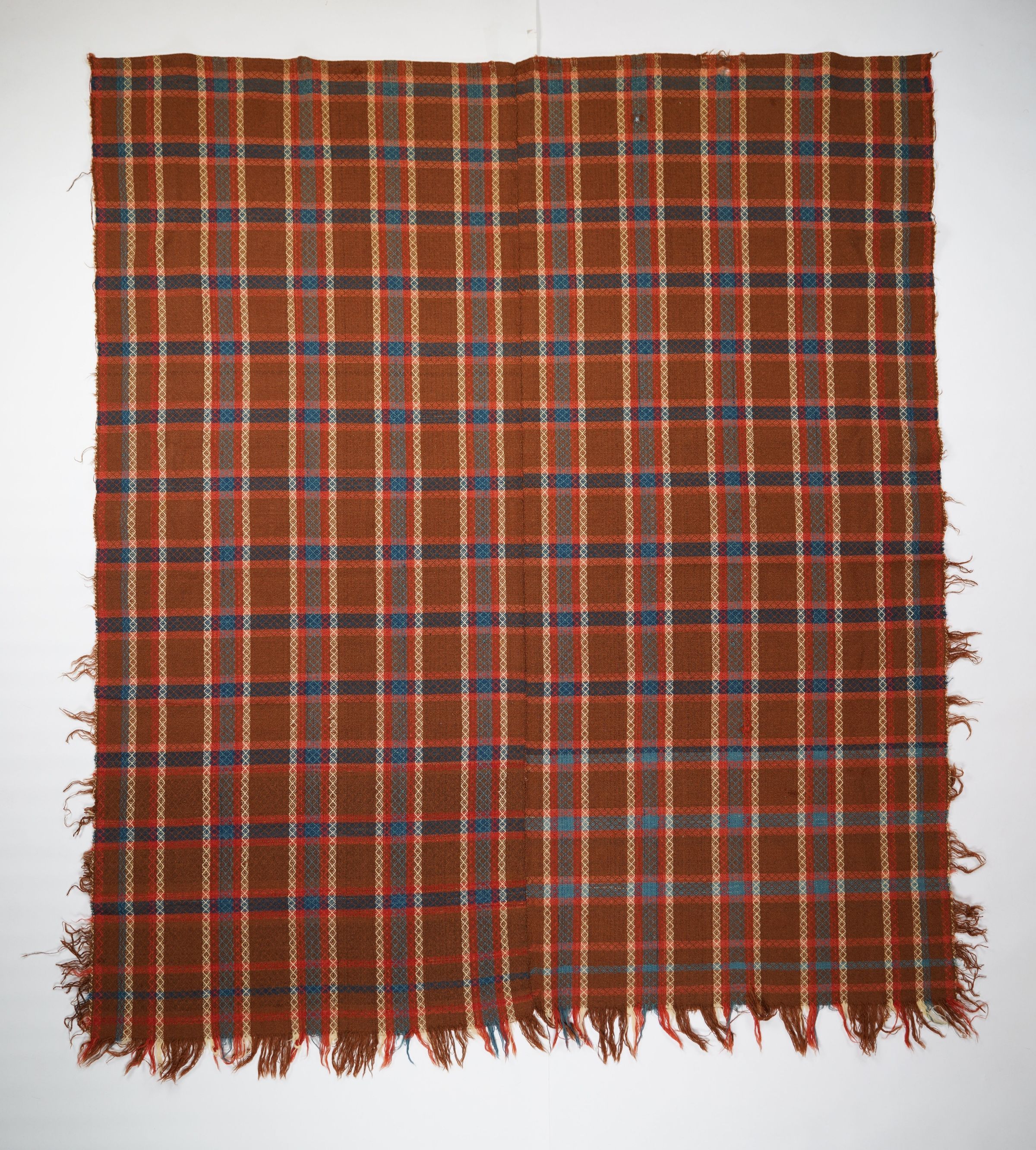 Brown, red, blue, navy, and natural geometric twill coverlet with border and self-fringe on three sides. Two joined panels.Collection