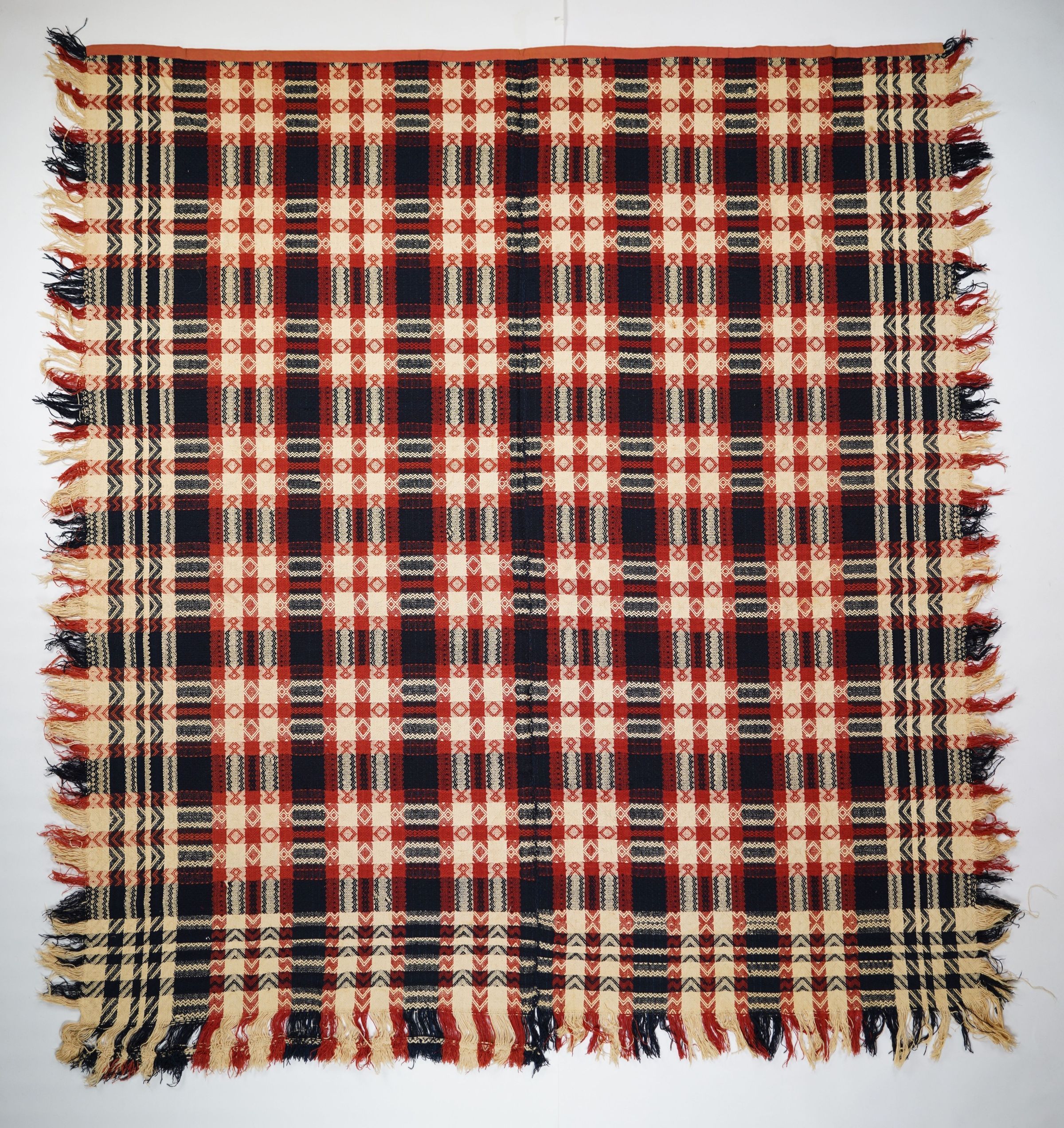 Red, navy, and natural geometric twill coverlet with border and self-fringe on three sides. Two joined panels.