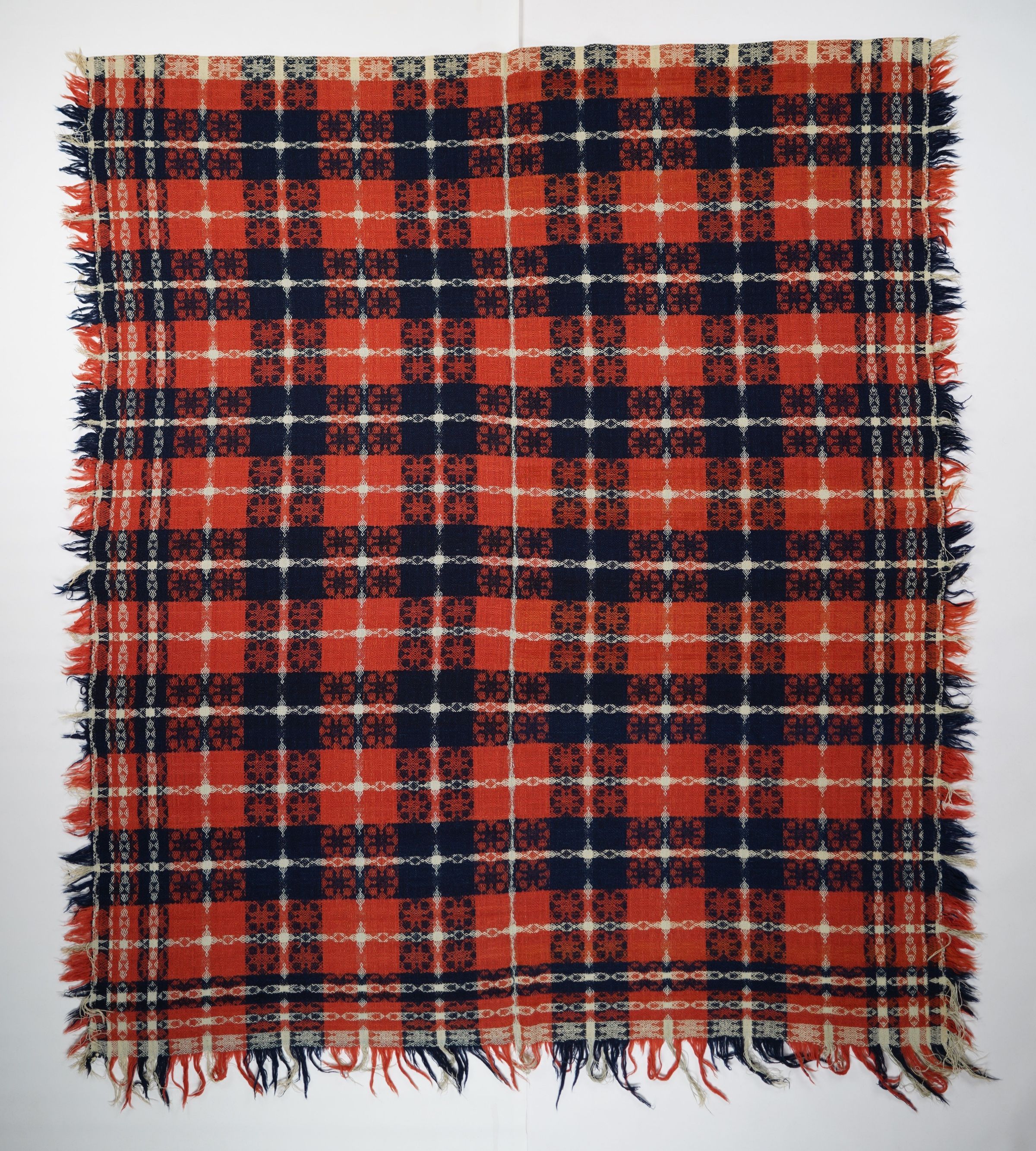 Red, navy, and natural geometric point twill coverlet with border and self-fringe on three sides. Two joined panels.Collection