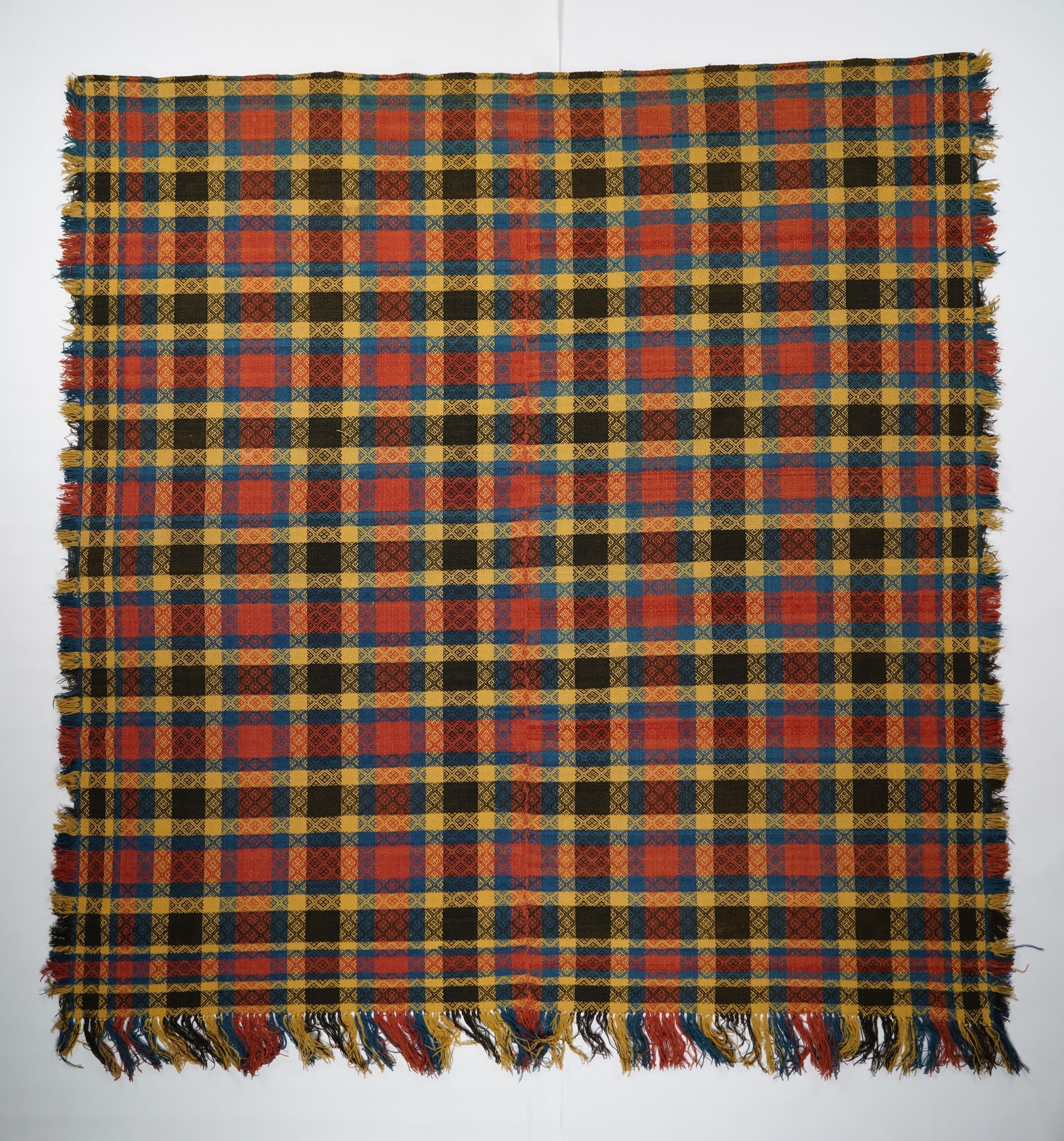 Red, blue, yellow, and black geometric twill coverlet with border and self-fringe on three sides. Two joined panels.Collection