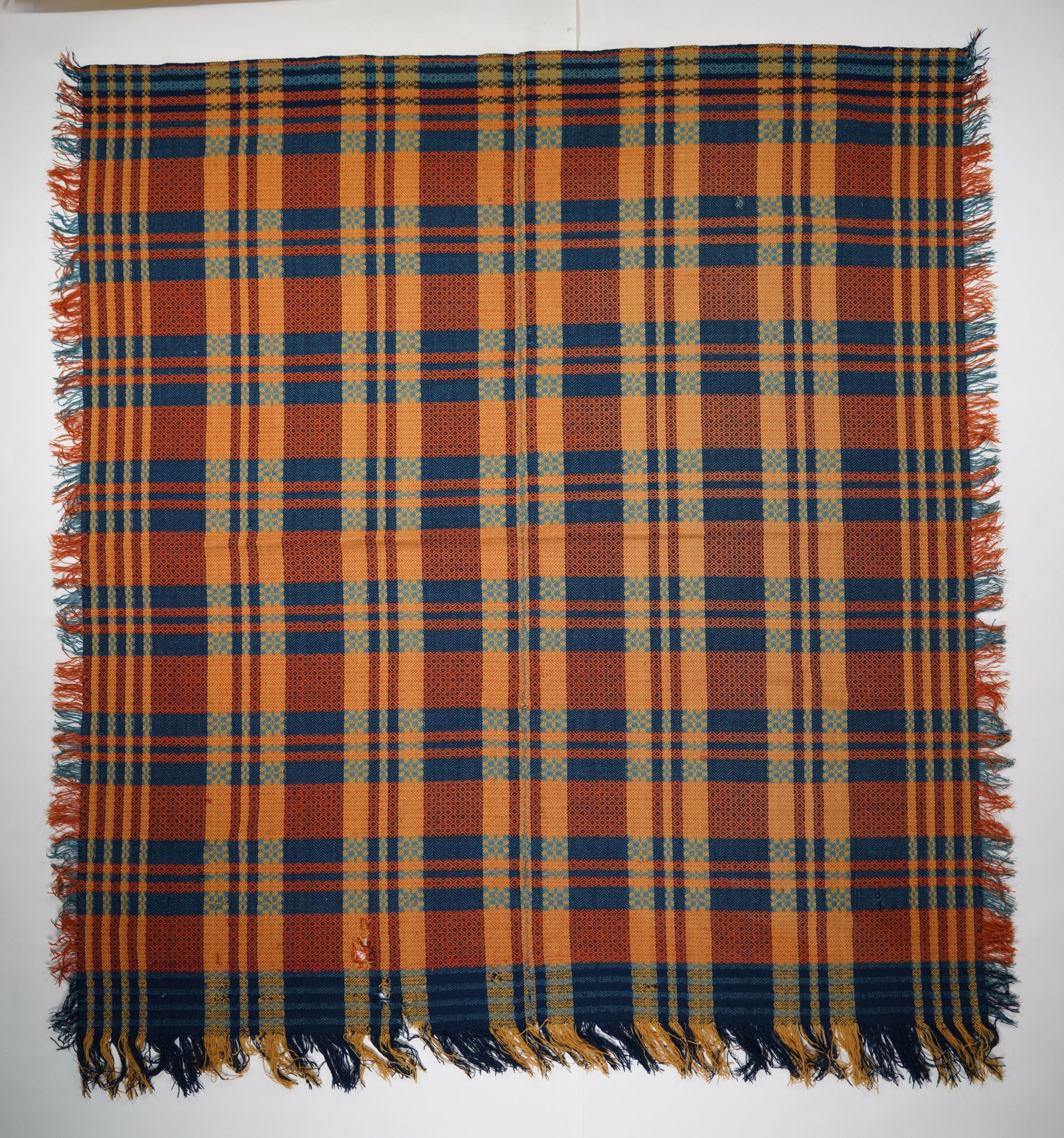 Red, blue, yellow, and navy geometric point twill coverlet with border on four sides and self-fringe on three sides.Collection